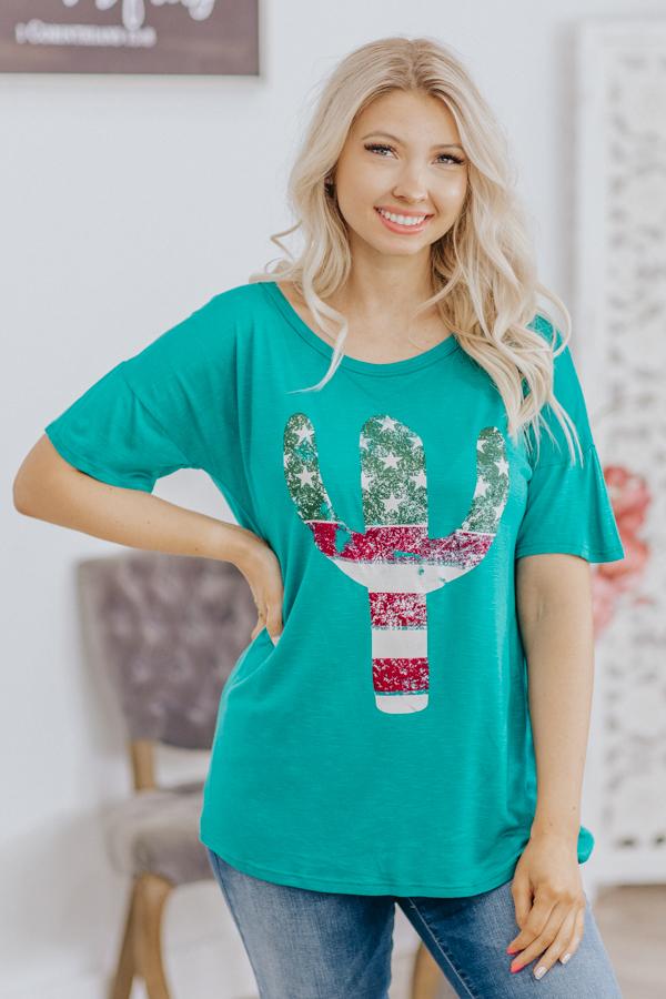 Arizona Moments Cactus Graphic Short Sleeve Top in Turquoise