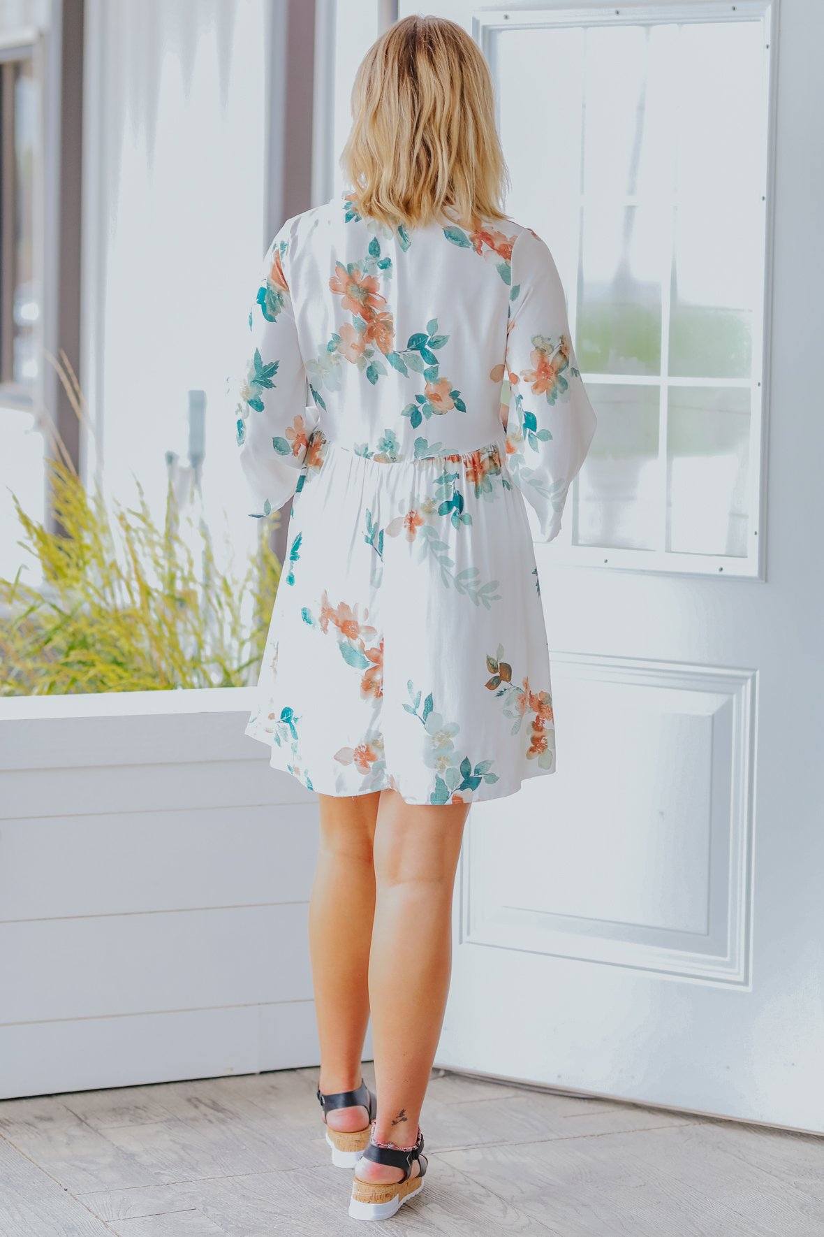Experience Trust Floral Empire Waist Short Bell Sleeve Dress in Ivory