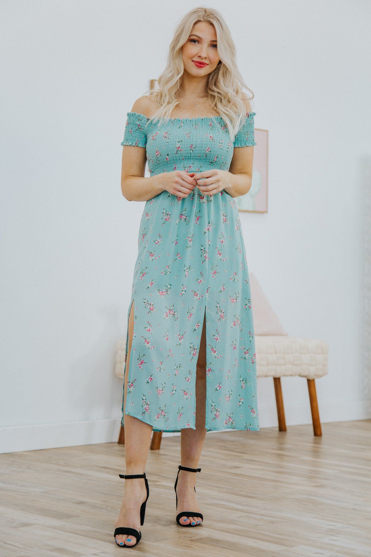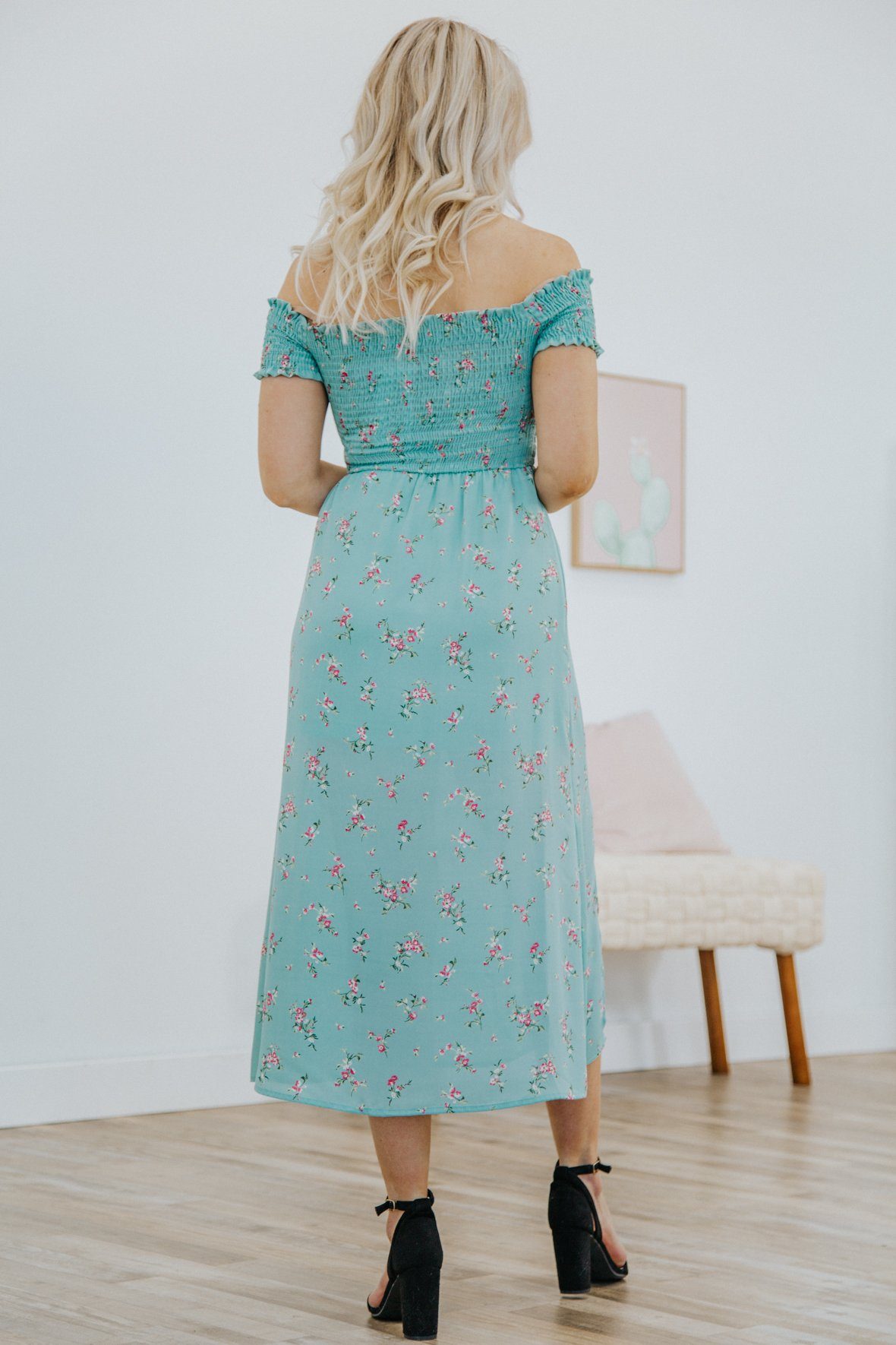 Can't Believe it Floral Smocking Off The Shoulder Side Slit Dress in Turquoise