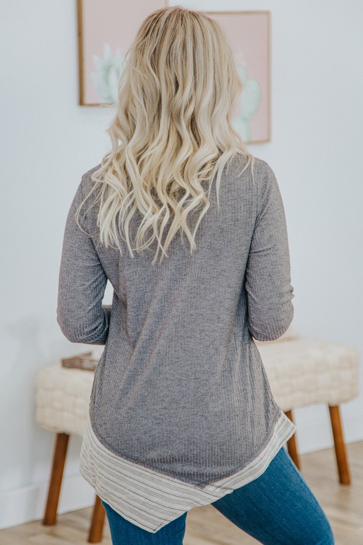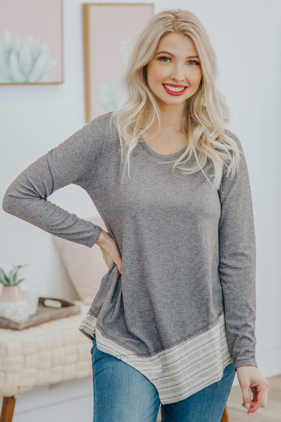 Focus On The Now Ribbed Contrast Hem Long Sleeve Top in Heathered Grey