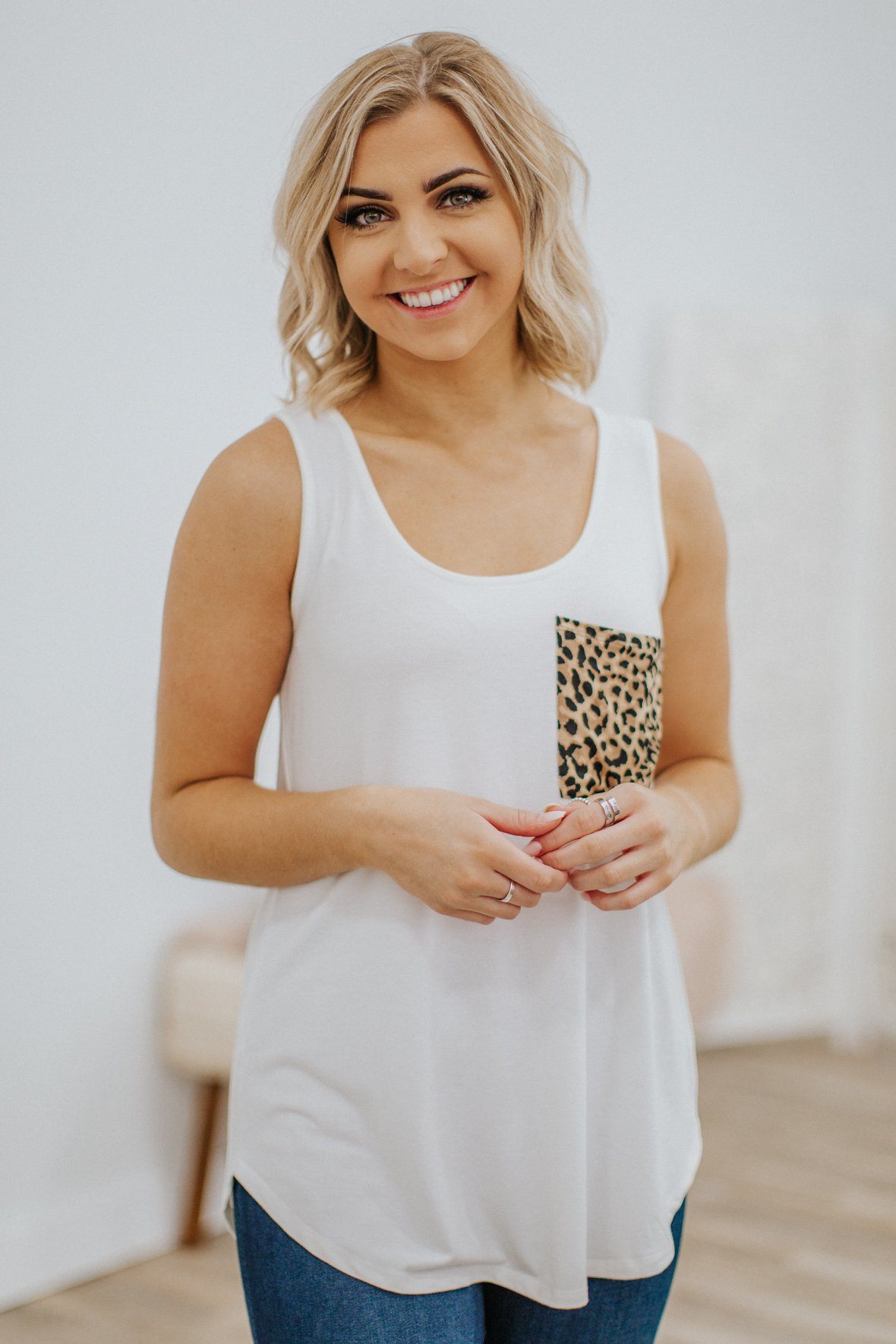 First In Line Sleeveless Leopard Pocket Tank Top in Ivory