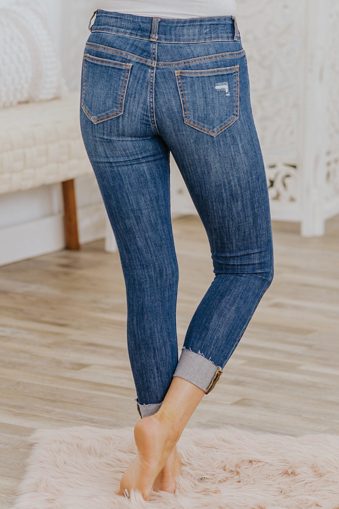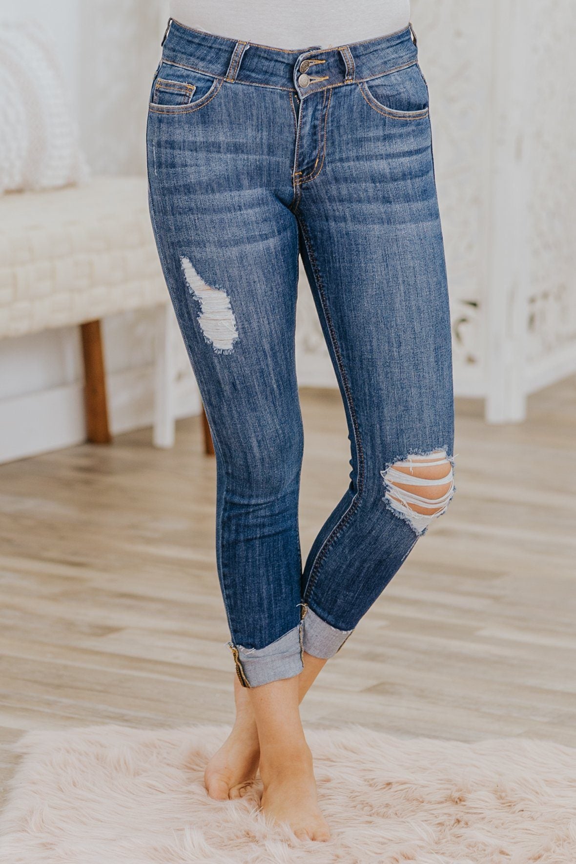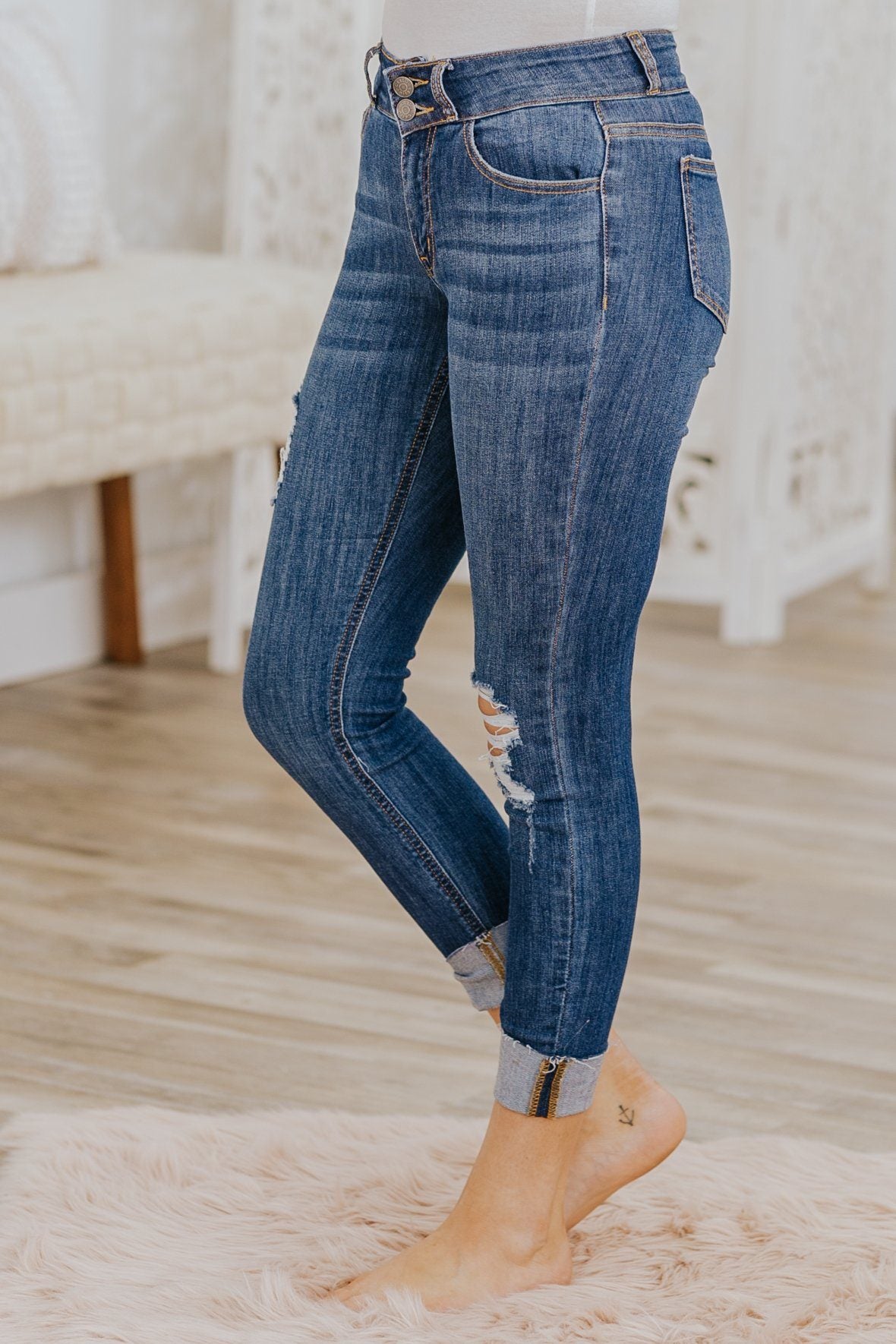 Chandra Cello Mid Rise 2 Button Dark Wash Distressed Rolled Hem Crop Skinny Jeans