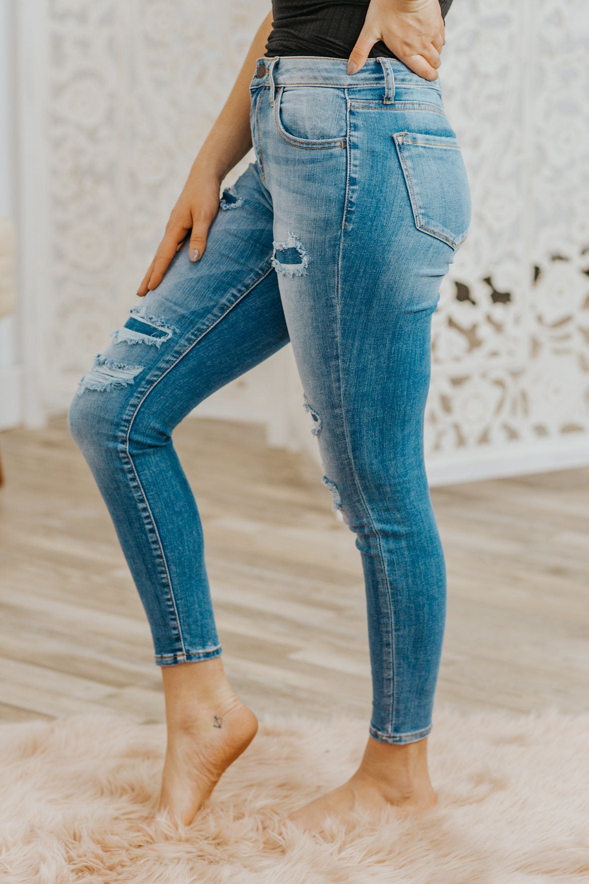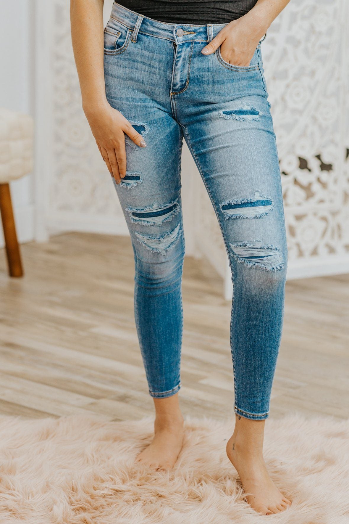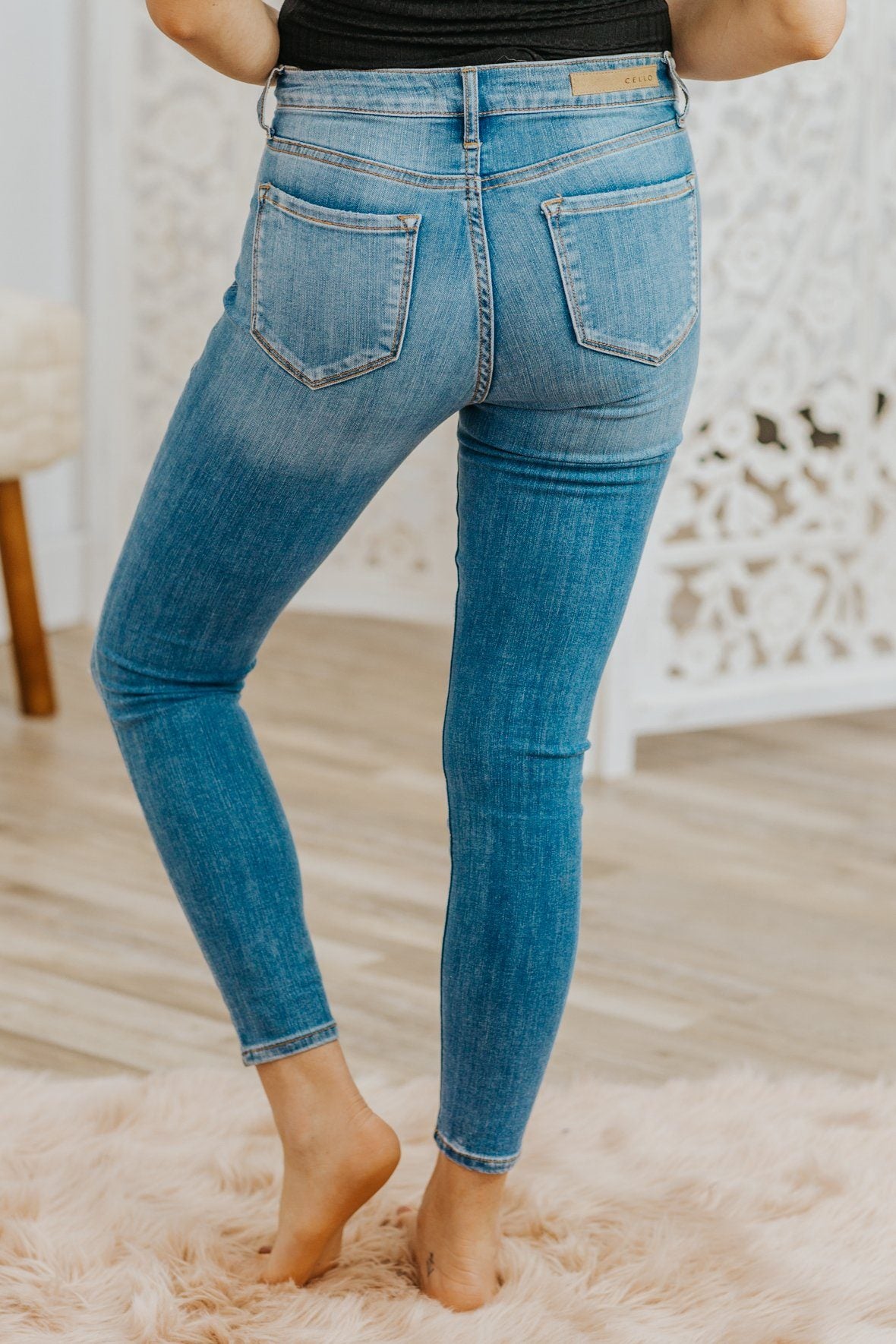 Carol Cello Mid Rise Medium Wash Distress Crop Skinny Jeans