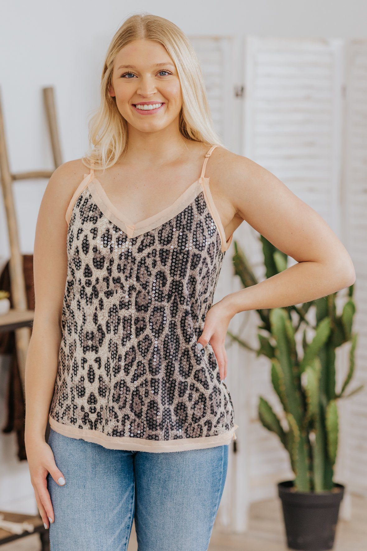 Bring On The Fun Leopard Sequin Tank Top in Peach