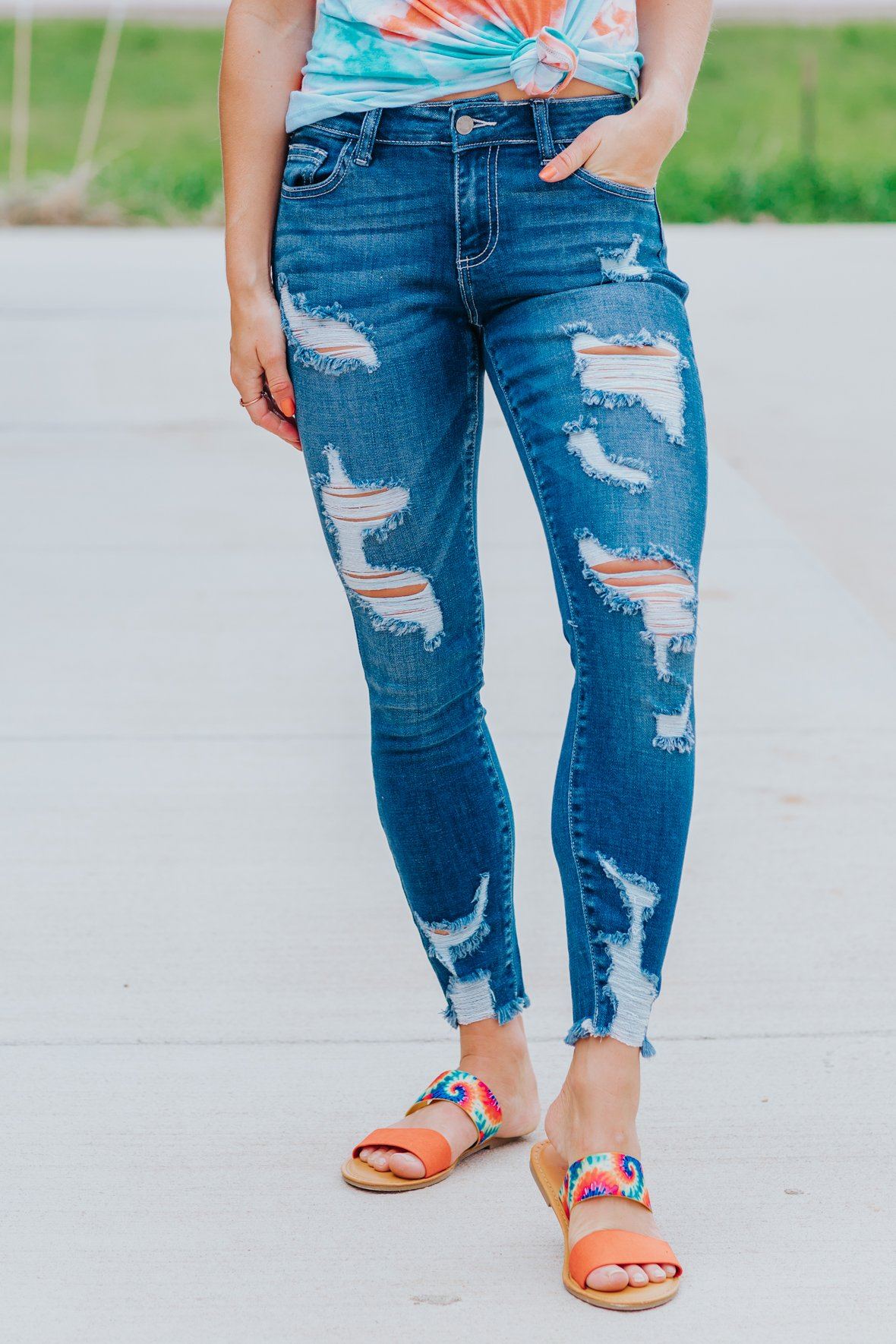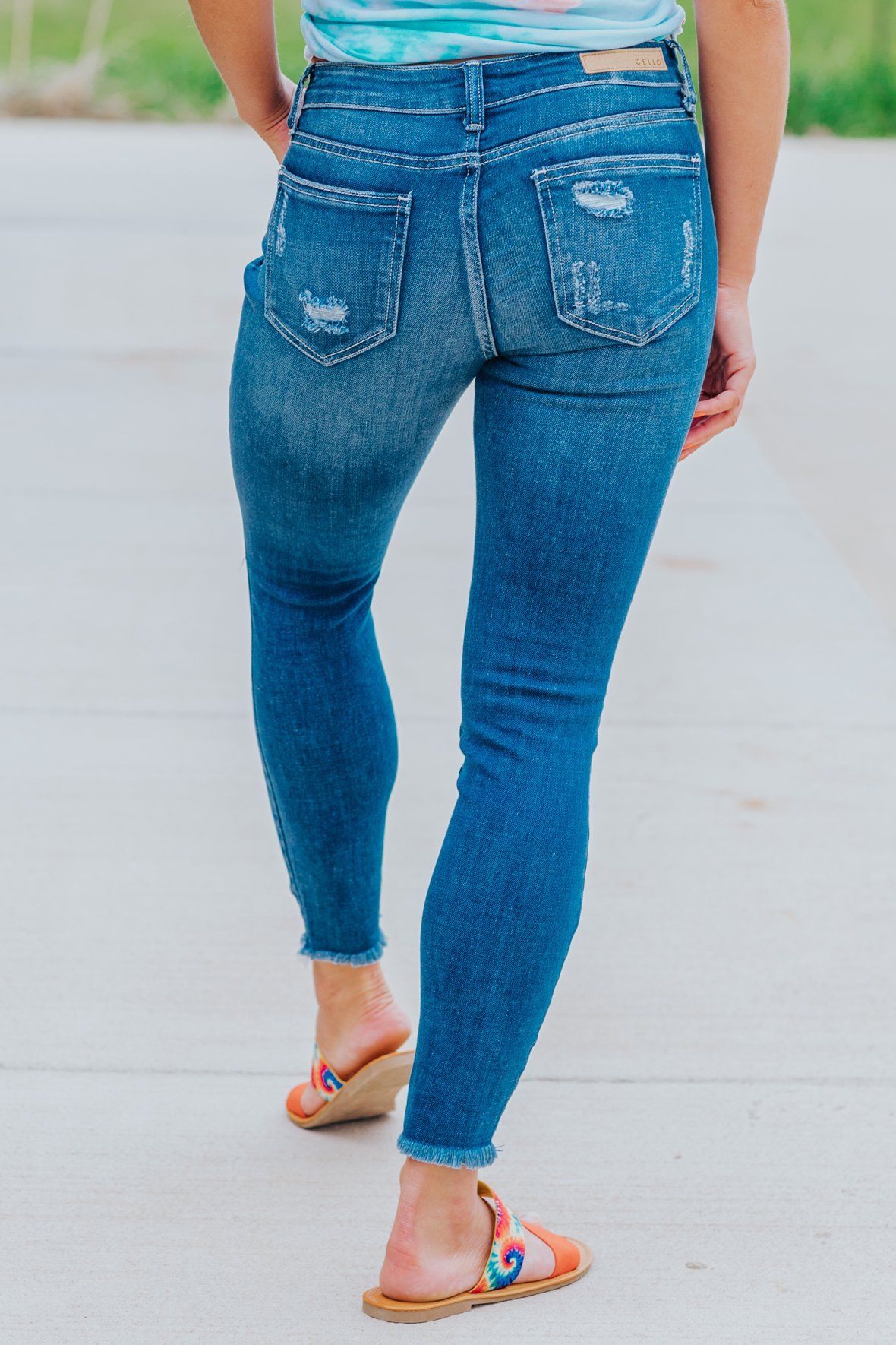 Christie Cello Mid Rise Raw Hem Crop Distressed Dark Wash Skinny Jeans