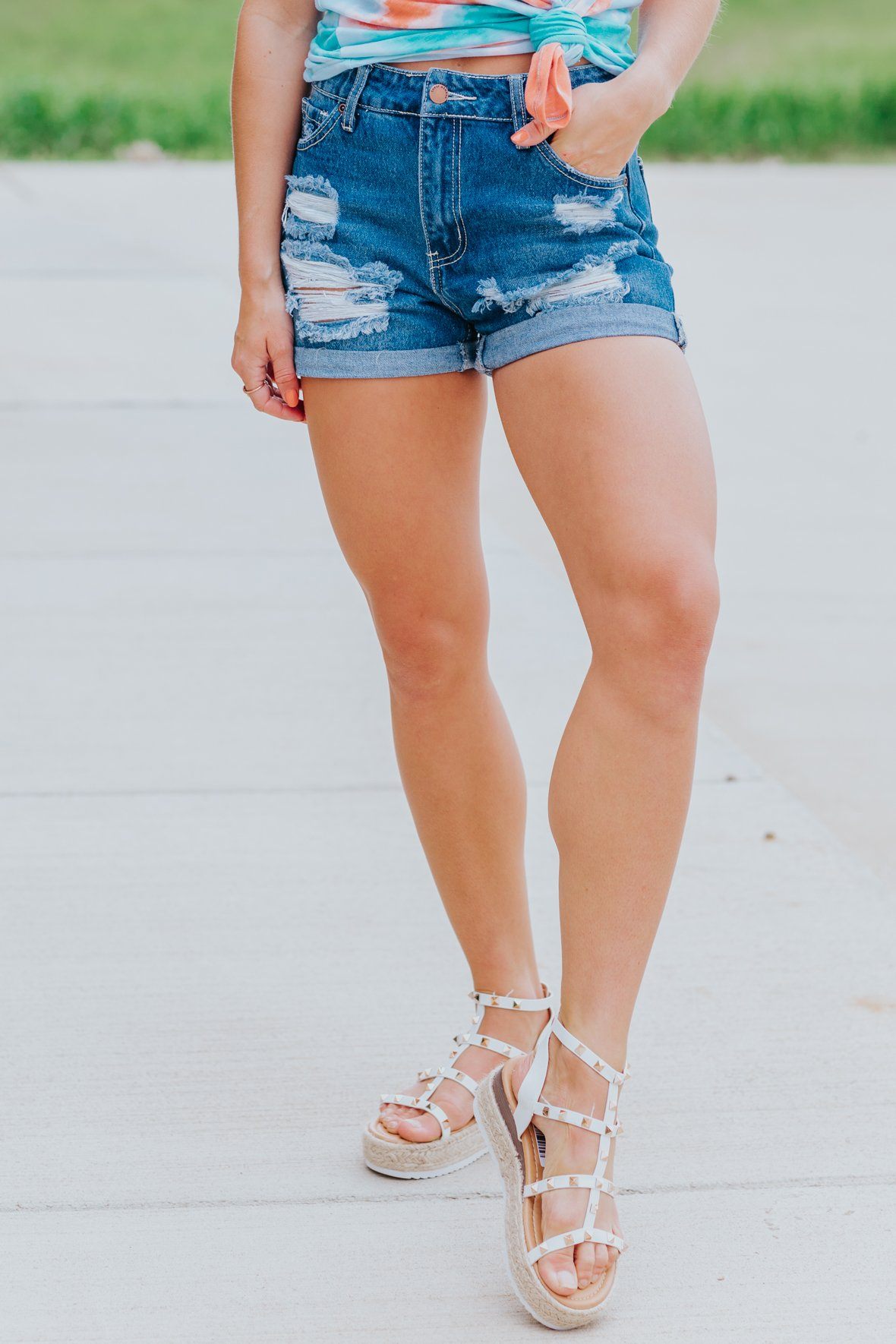 Coming Home Soon High Rise Distressed Folded Hem Medium Wash Jean Shorts