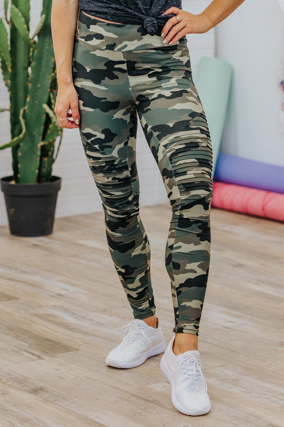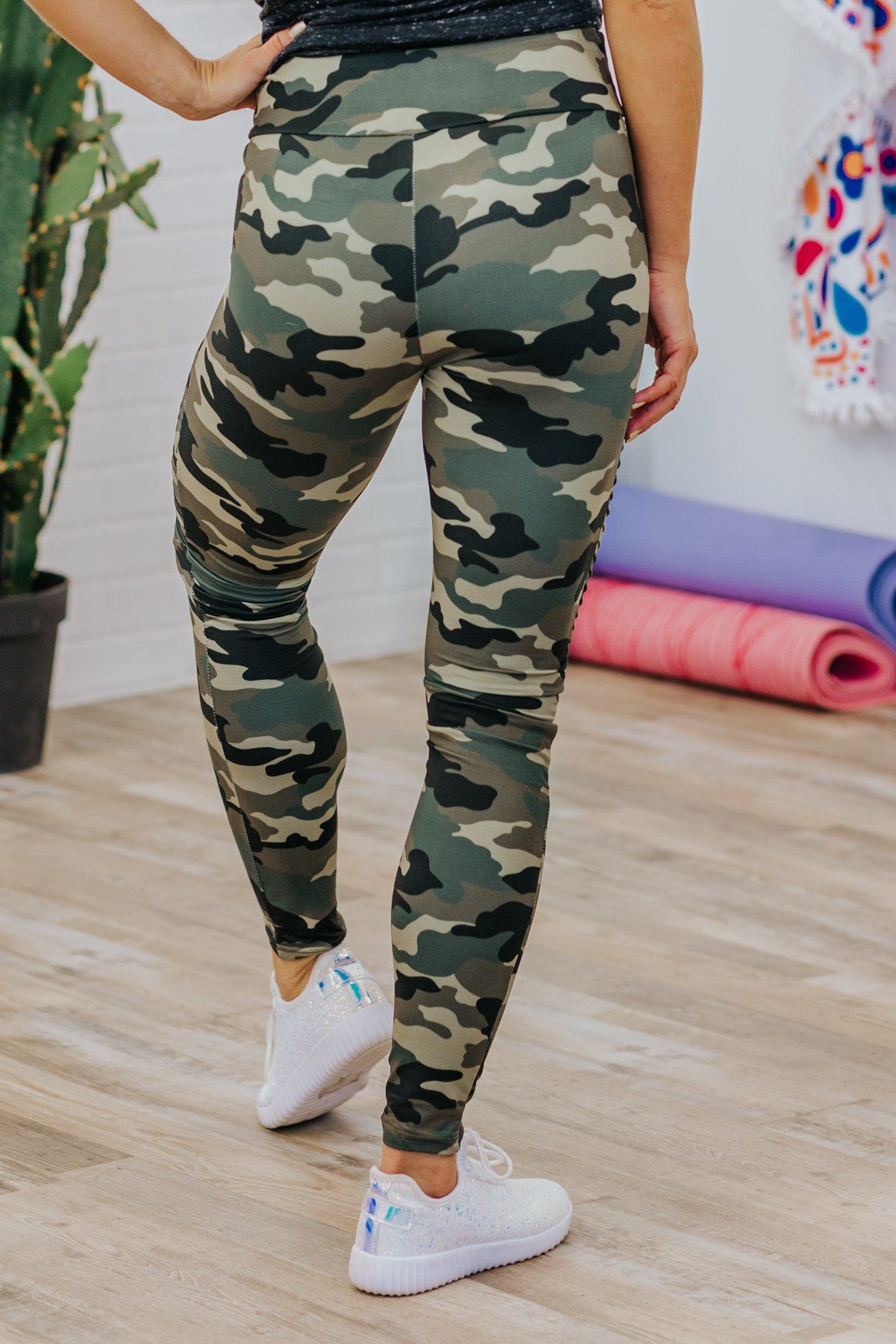 Be Better Than Yesterday Camo Printed Elastic Waist Leggings in Olive Green