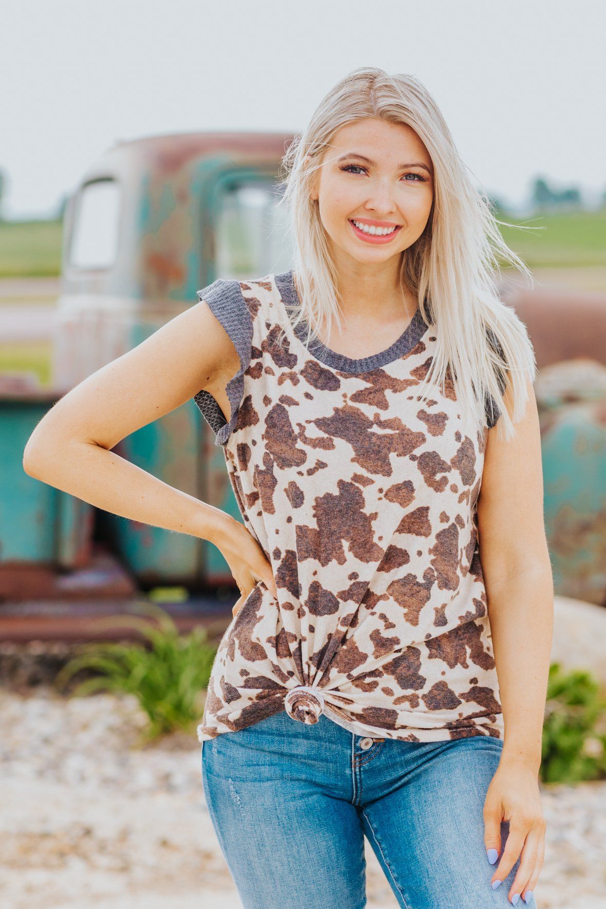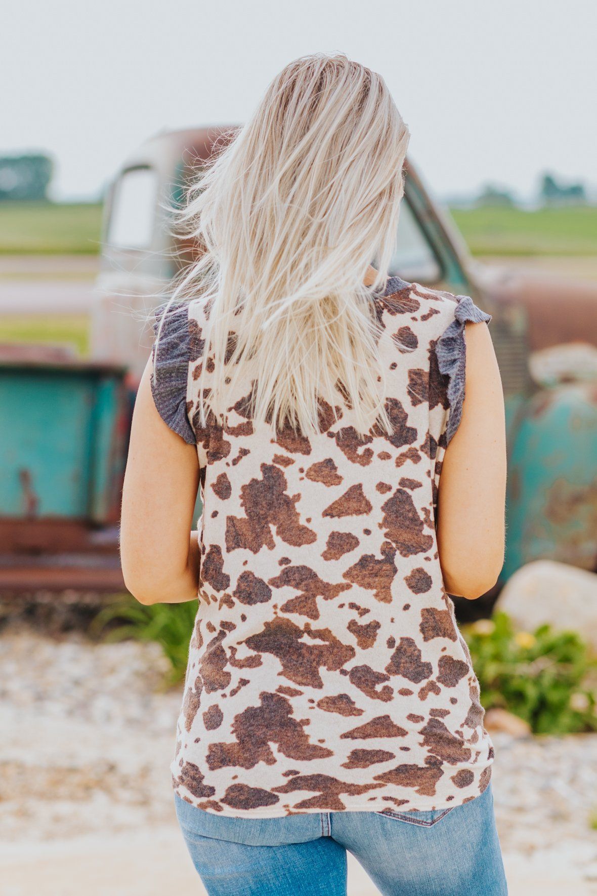 Don't You Want Me Cow Print Ruffle Detail Tank Top in Brown