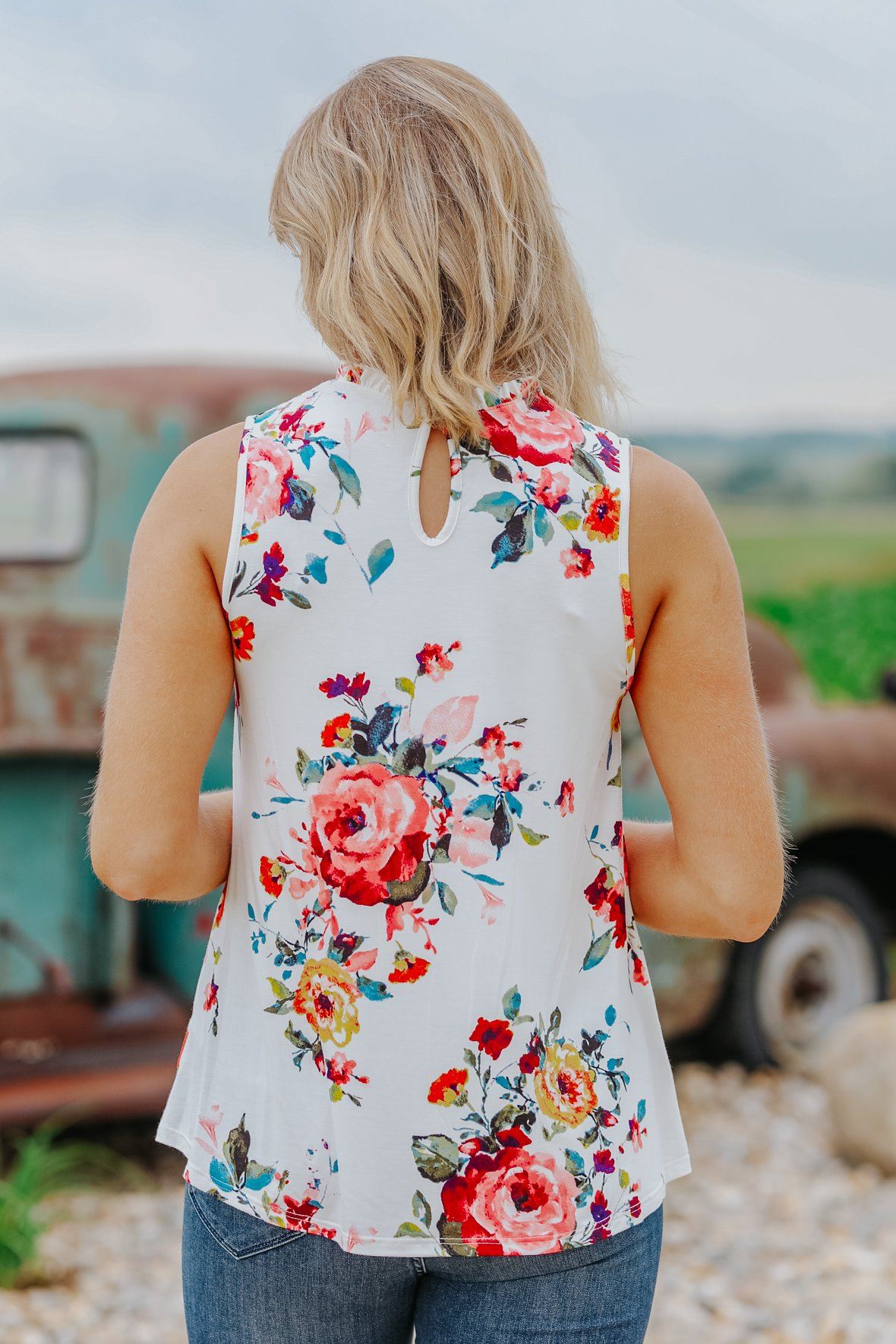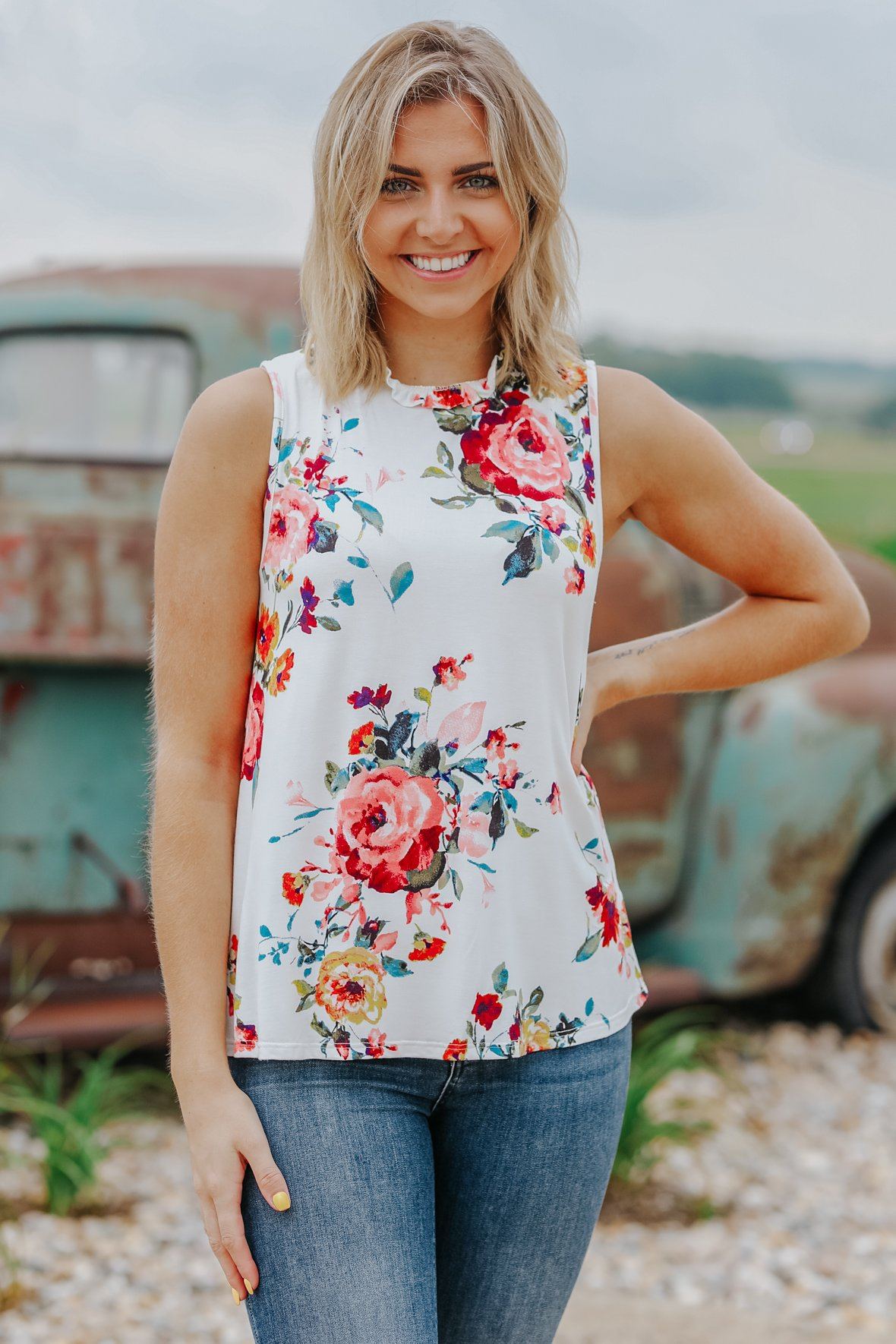 Feeling Pretty Good Floral Print Ruffle Detail Tank Top in Ivory