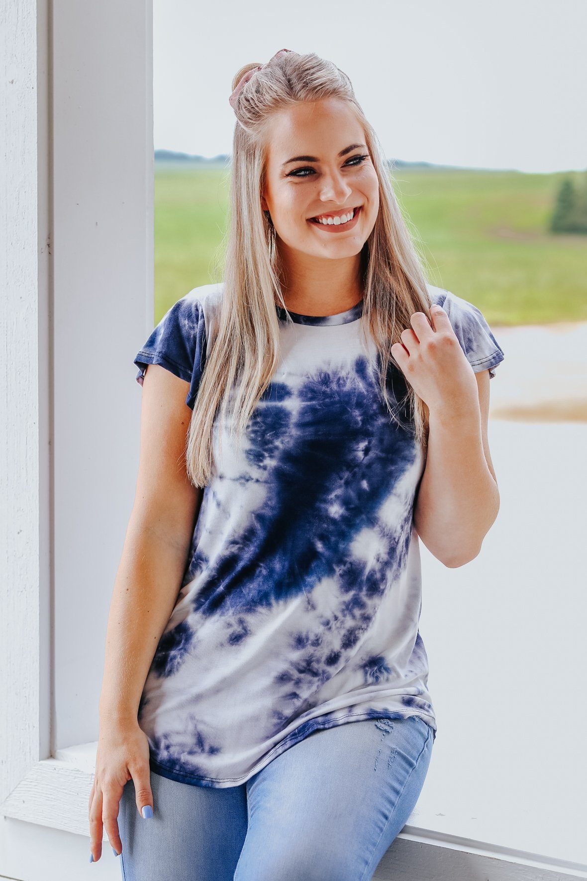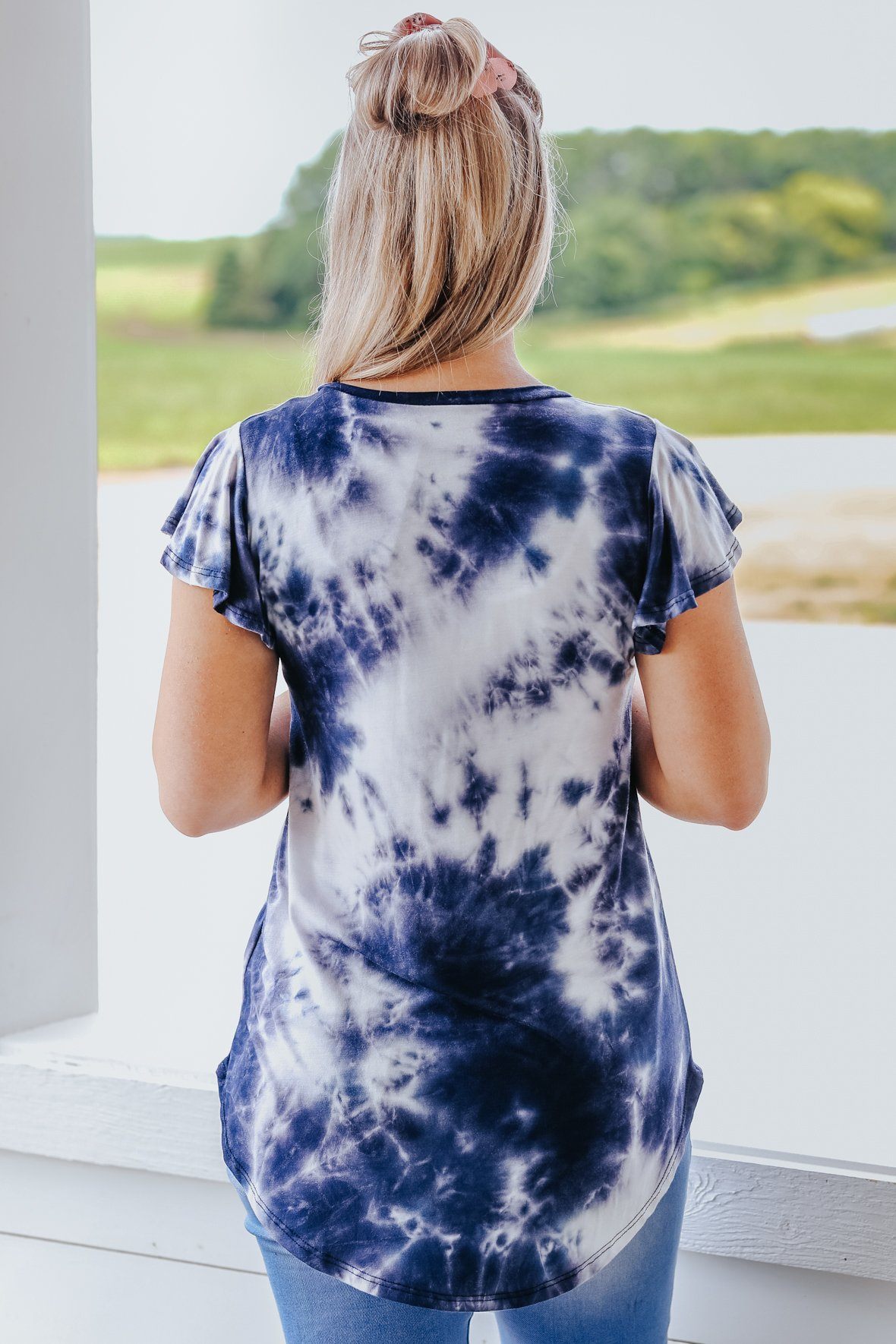 Come With Me Tie Dye Ruffle Detail Short Sleeve Top in Navy