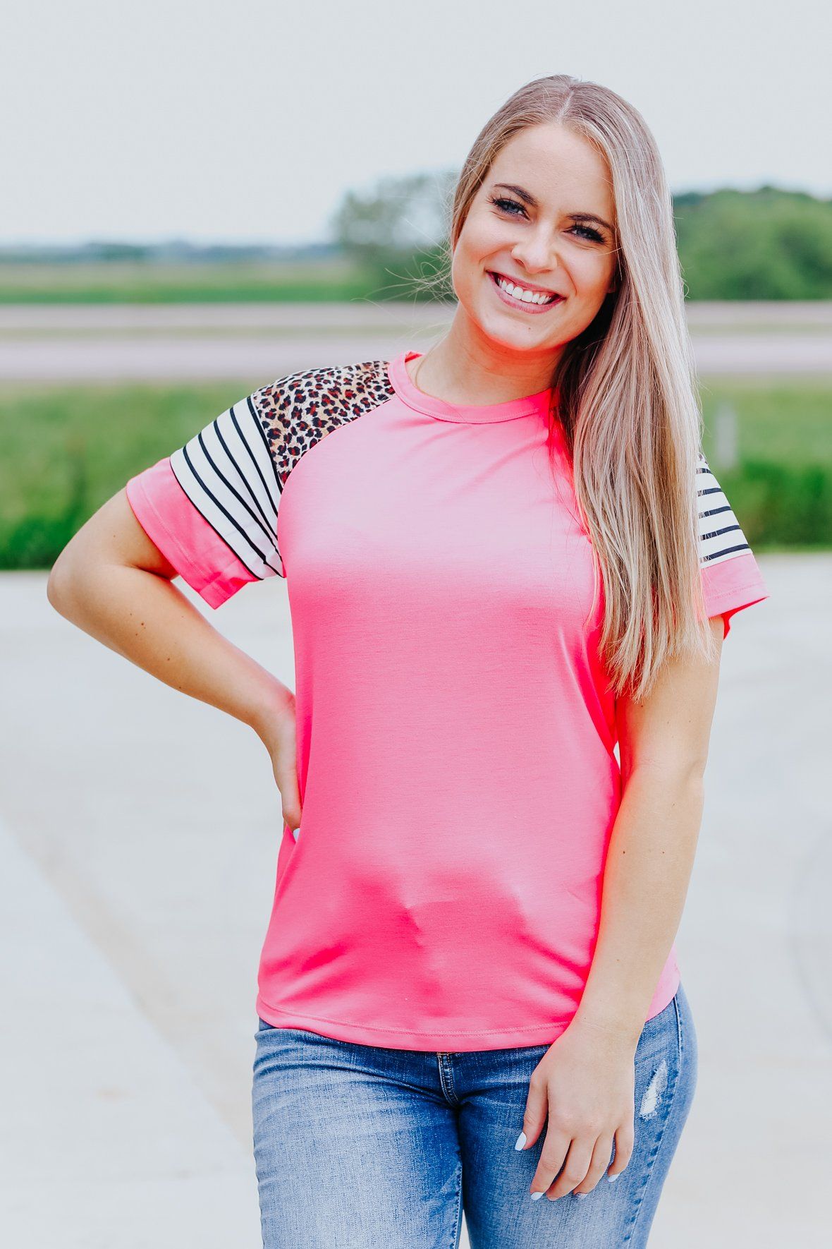 Complicated Love Stripes Leopard Short Sleeve Top in Hot Pink