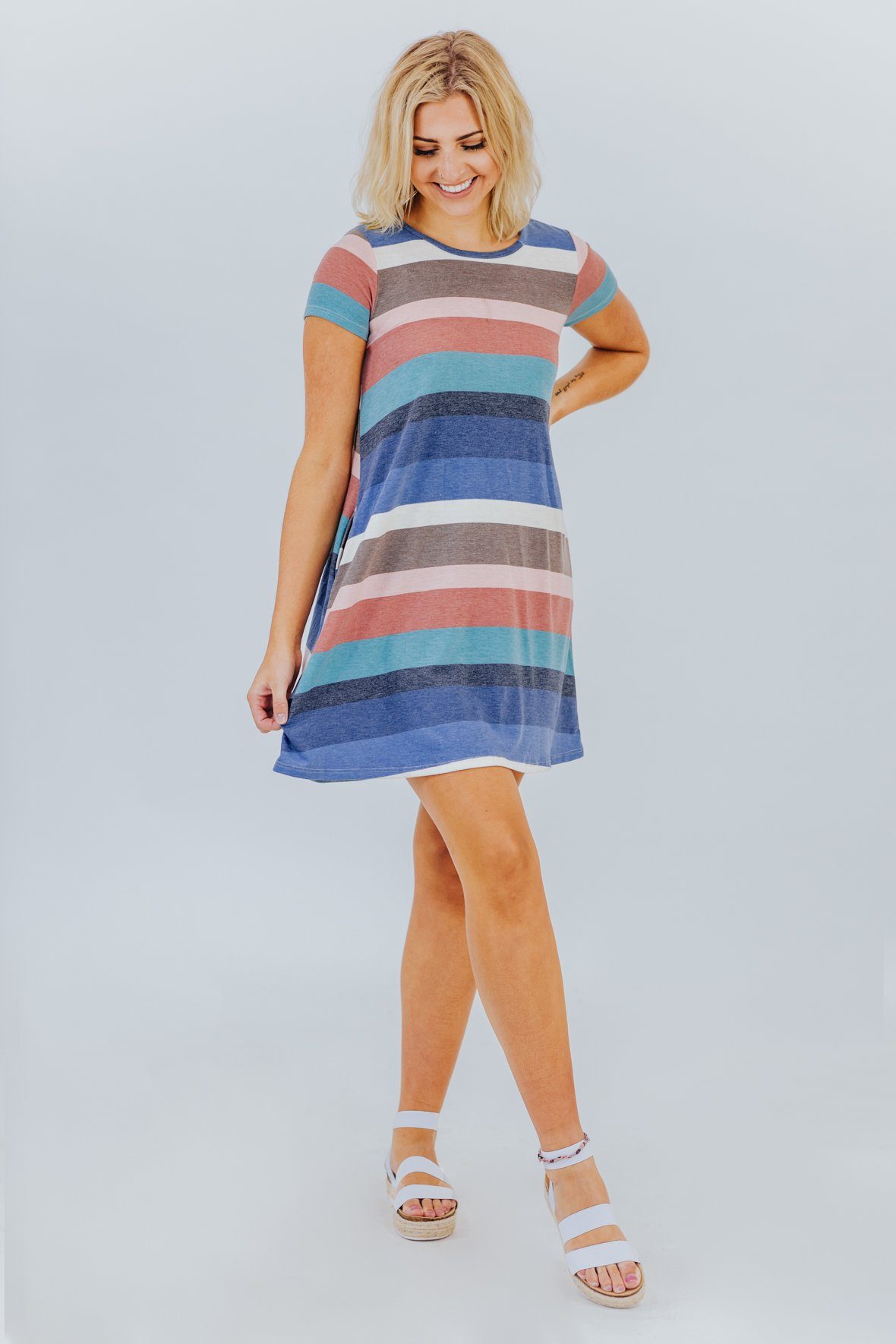 Front Row Seat Shift Dress in Brick and Deep Blue