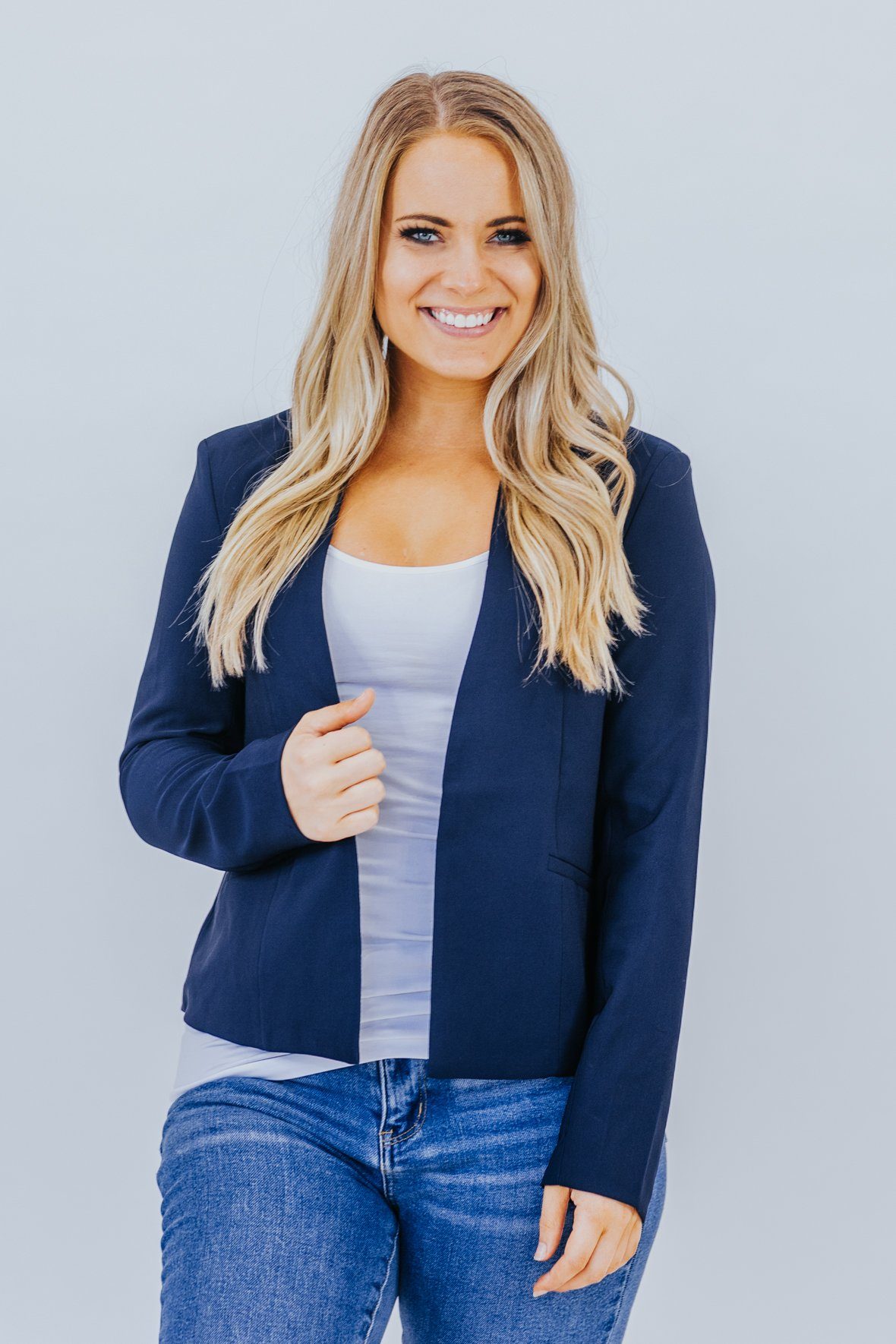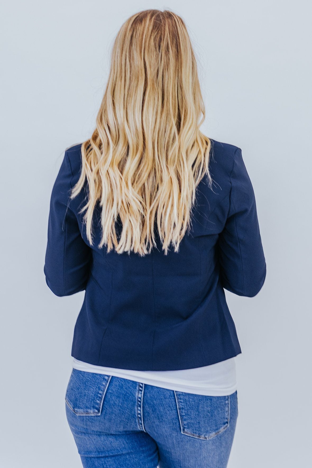 Business As Usual Open Front Blazer Jacket in Navy