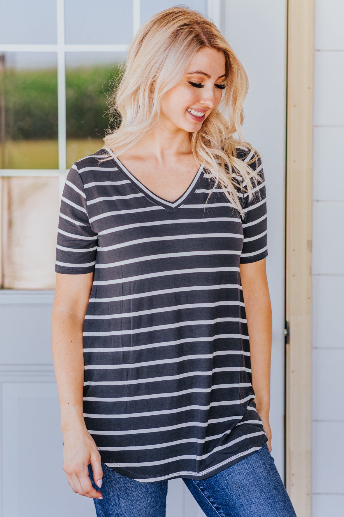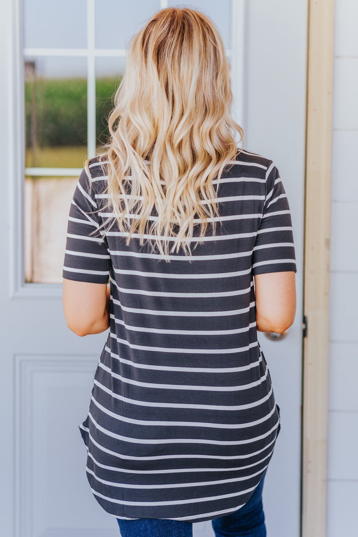 Everyday Running V Neck Striped Short Sleeve Top in Charcoal