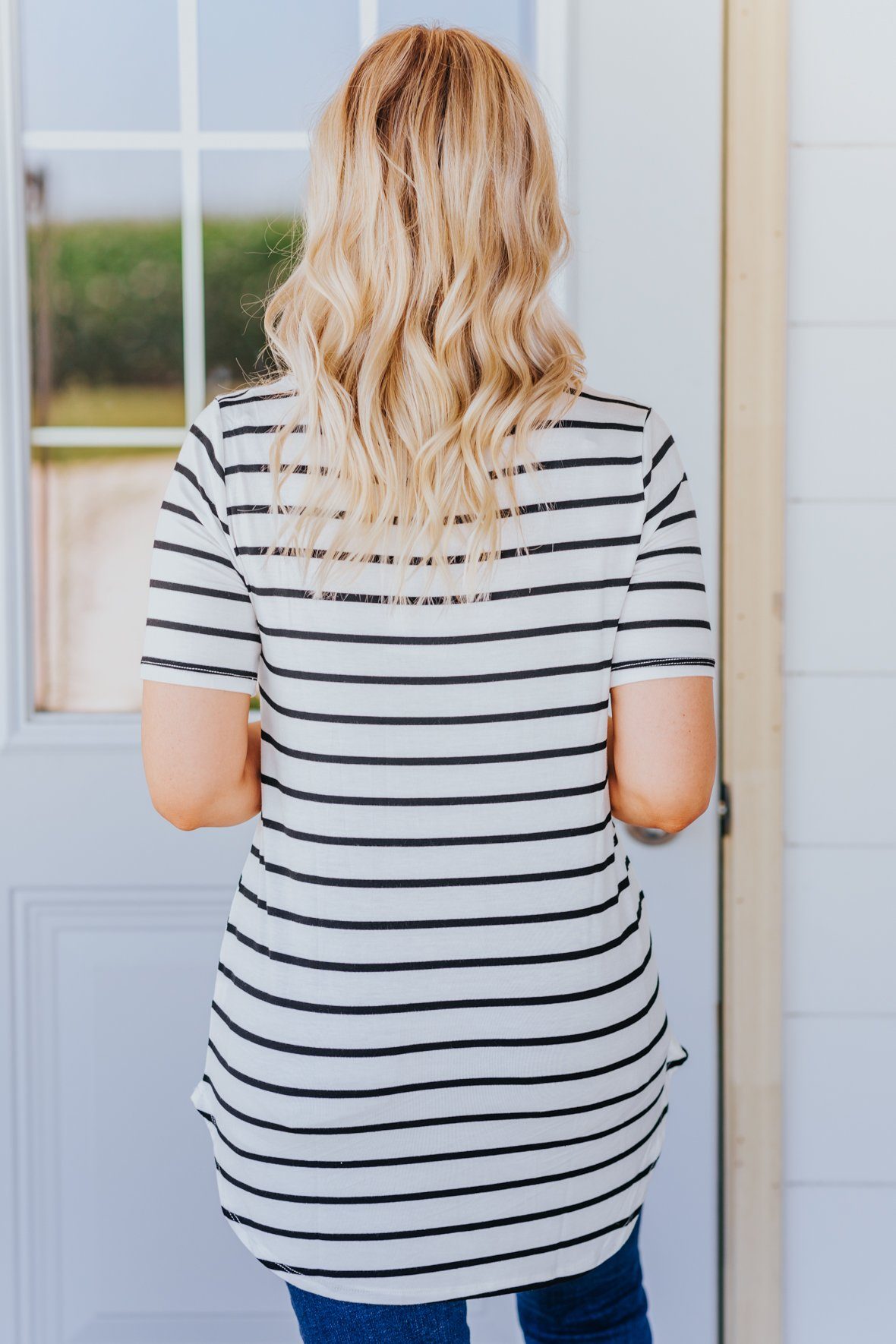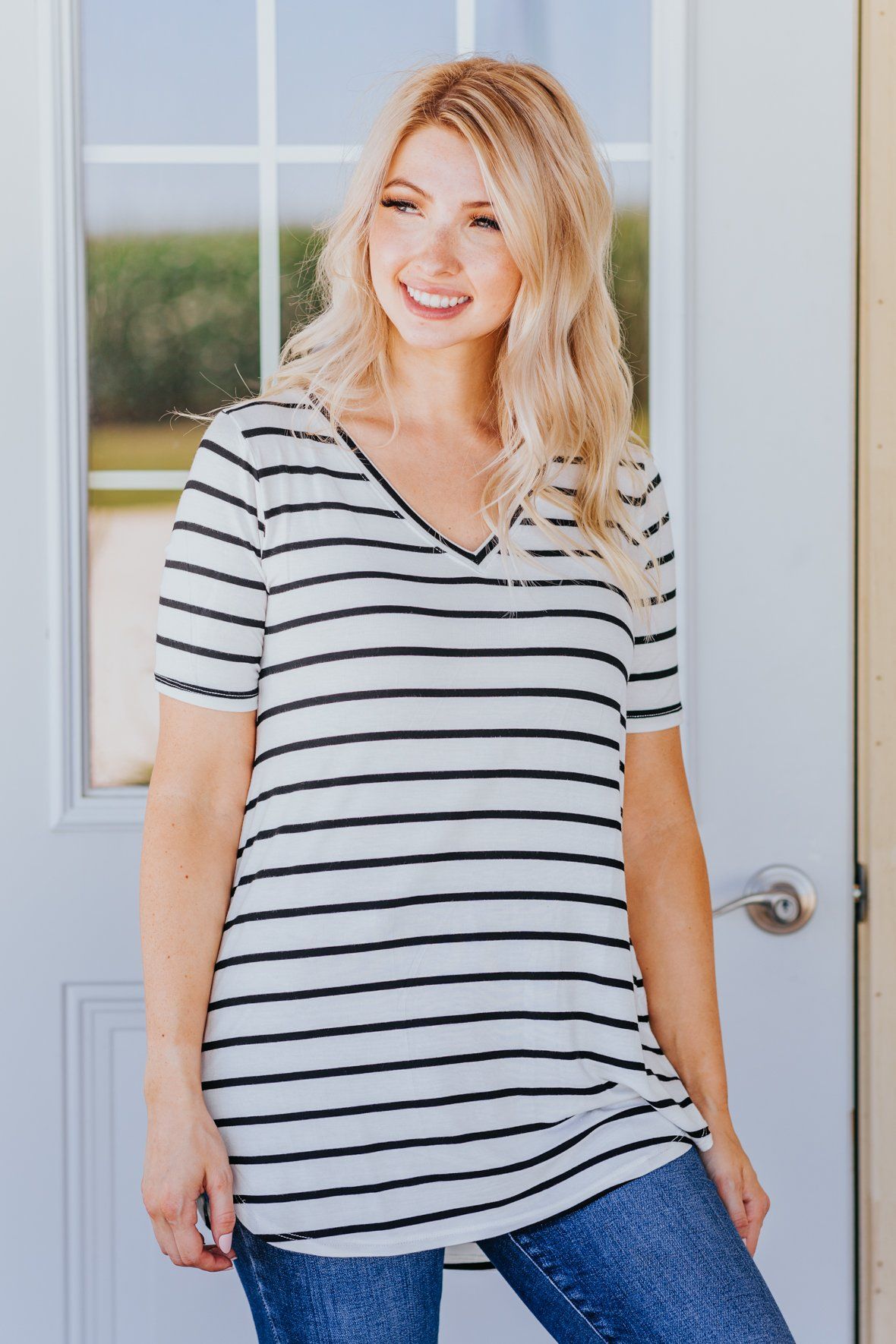 Everyday Running V Neck Striped Short Sleeve Top in Ivory