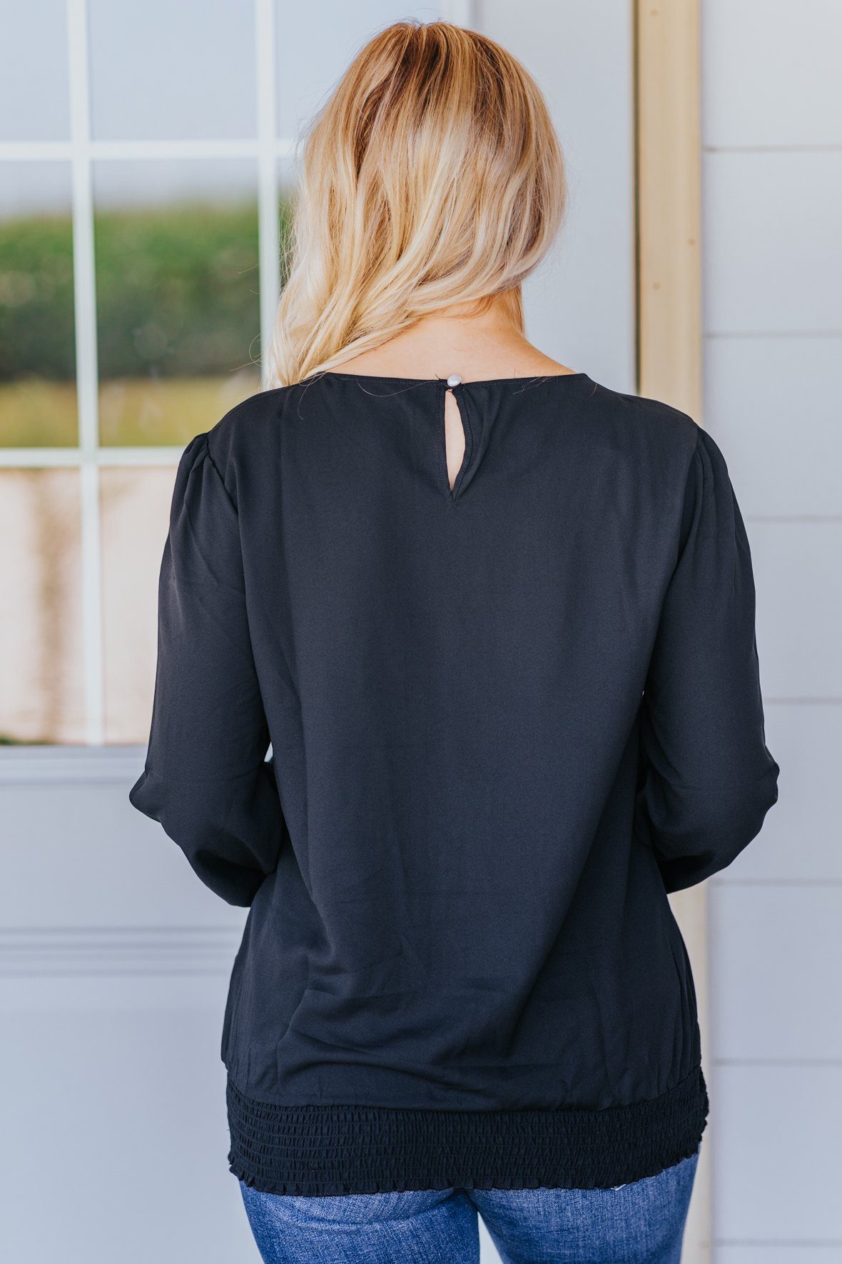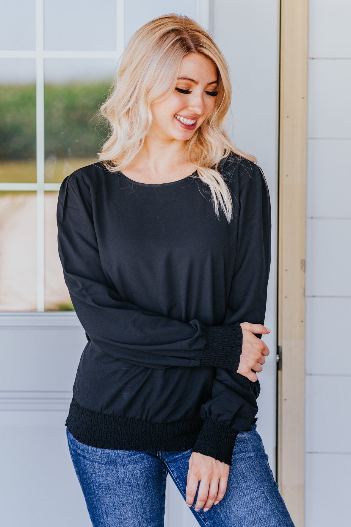 Sunday Morning Vibes Smocked Hem Long Sleeve Top in Black