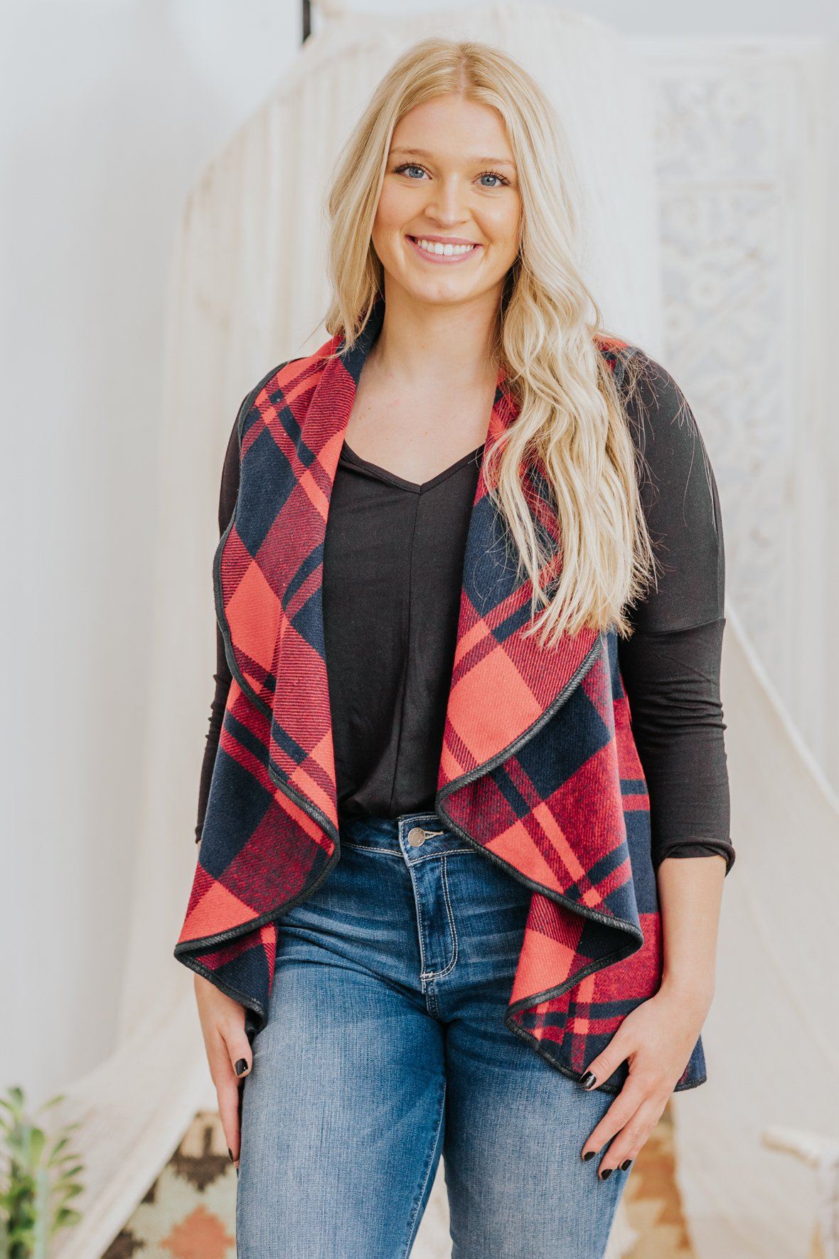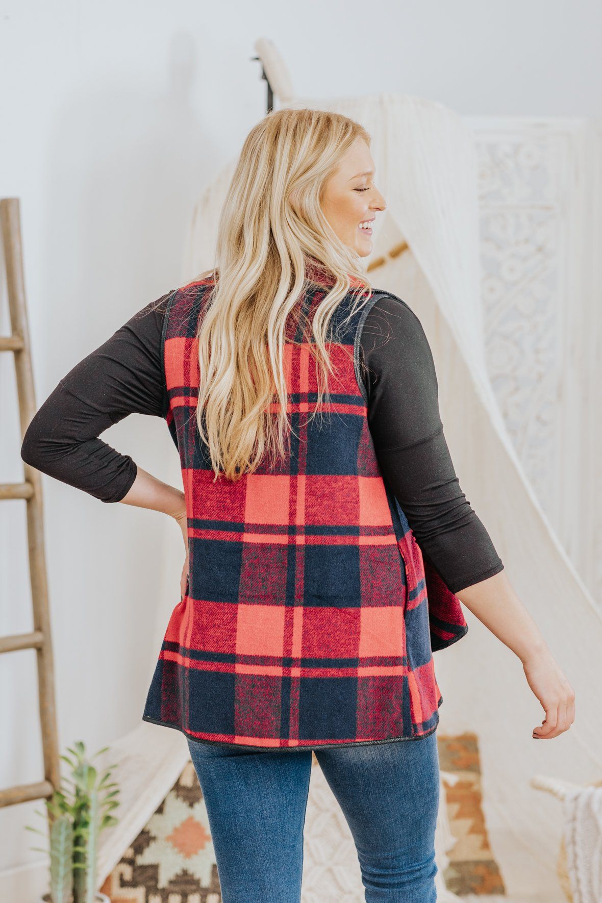 - Length in Small 25" Medium 25.5" Large 26"True to SizeJessica is 5’9”, 34B, and is wearing a size small.*This photo has been edited. True colors are red and navy blue.*
