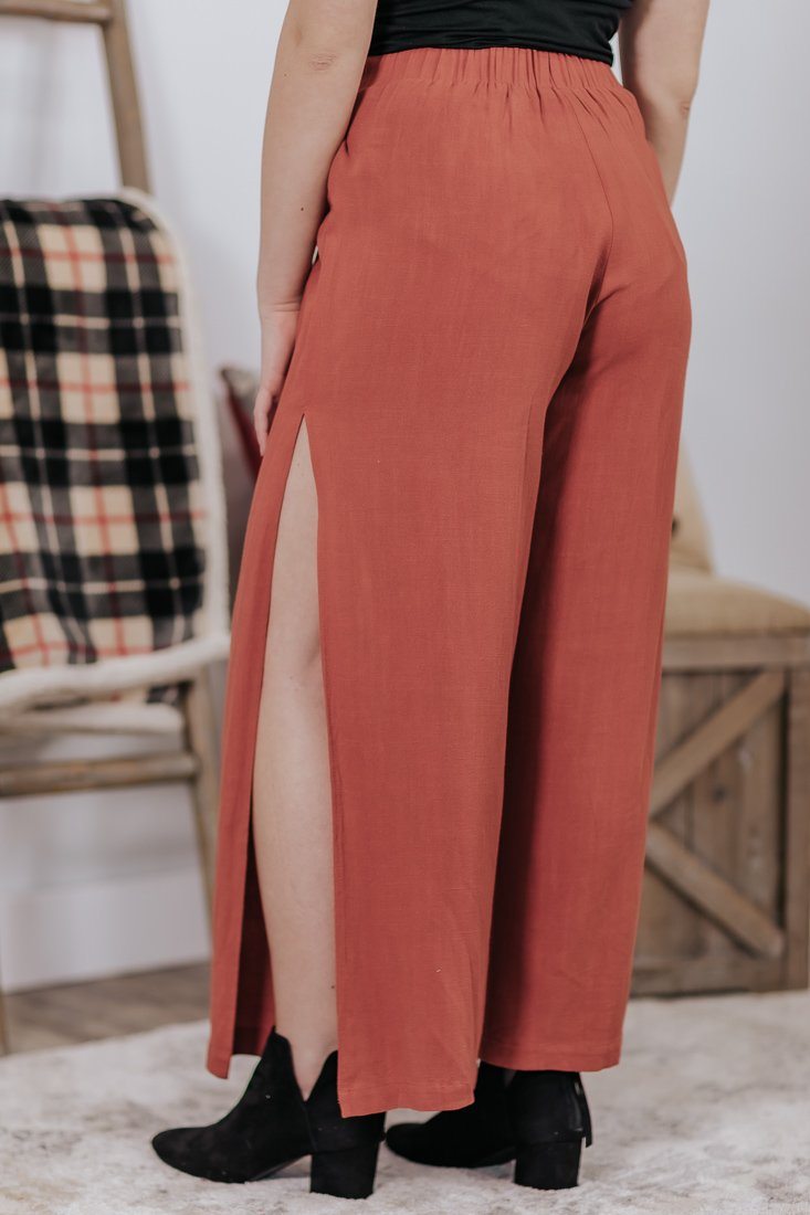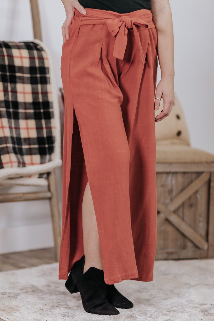 Better Days Ahead Wide Leg Side Slit Tie Elastic Waist Pants in Burnt Orange