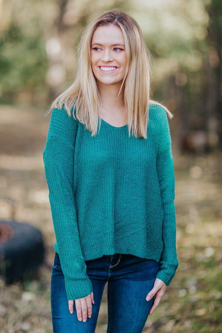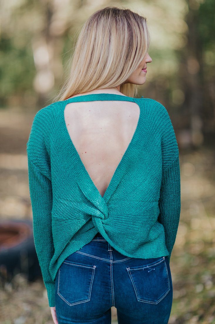 Addicted Knit Long Sleeve Open Back Twist Top in Jade Green