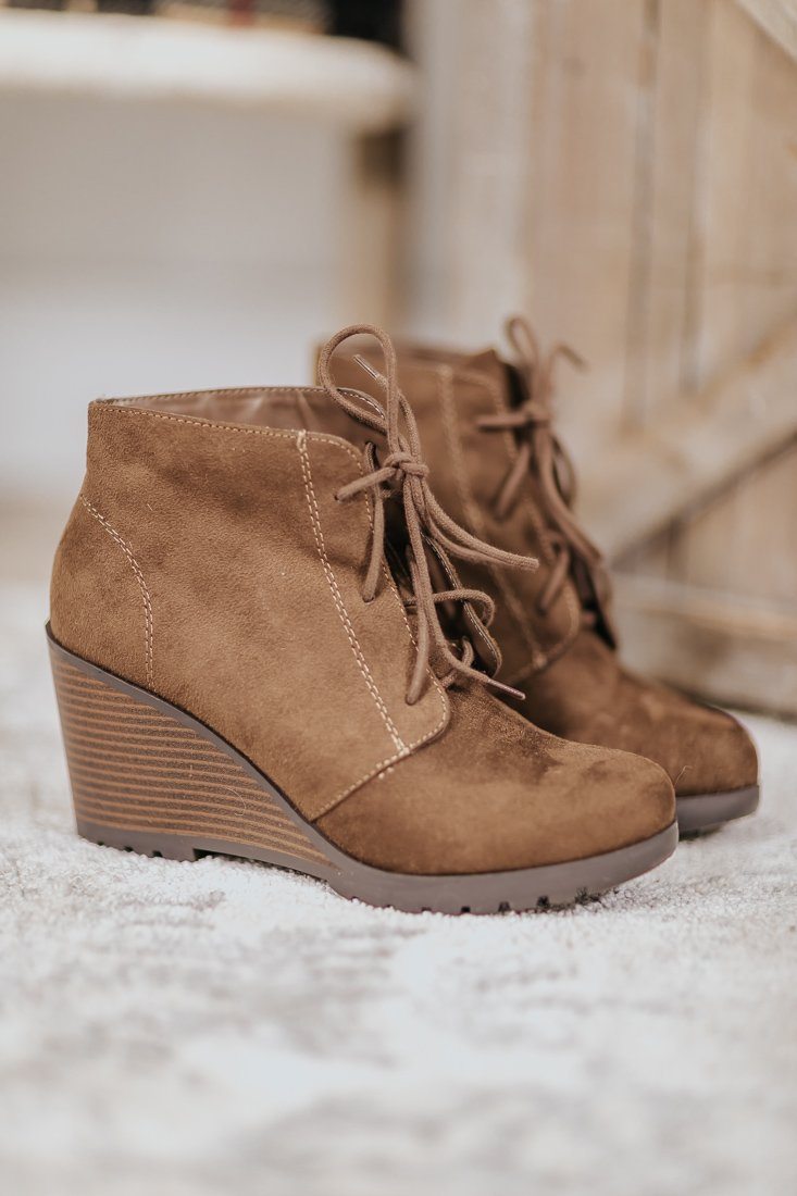 Forever Yours Lace Up Booties Wedge in Brown