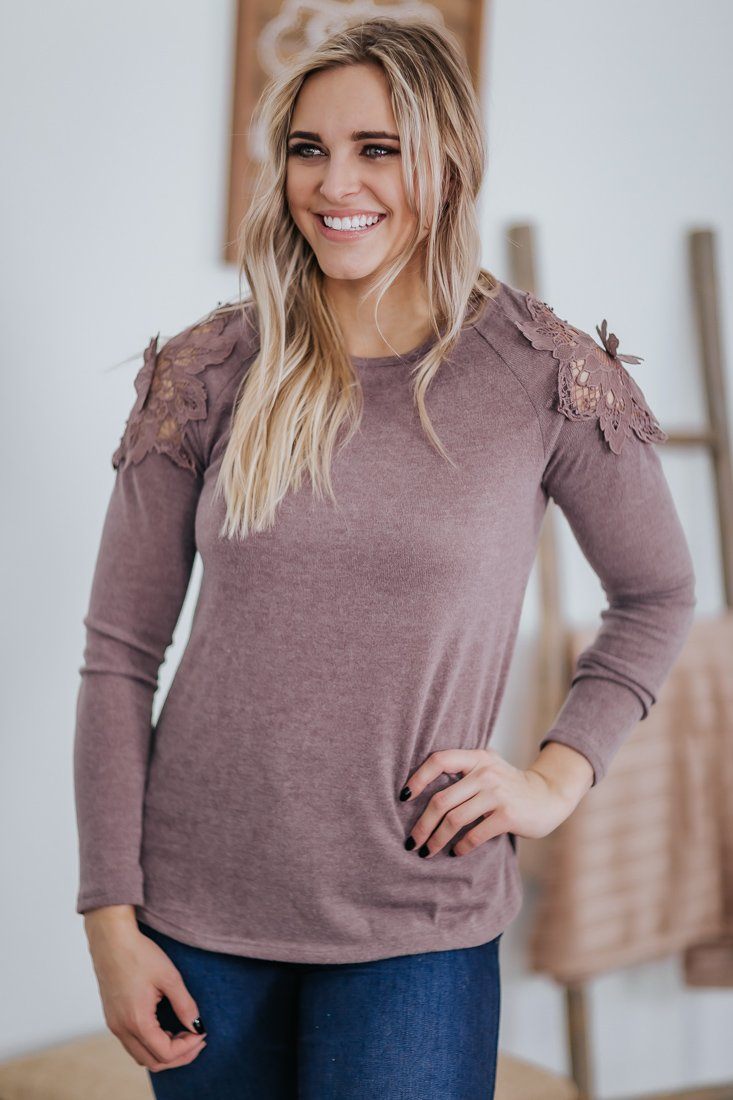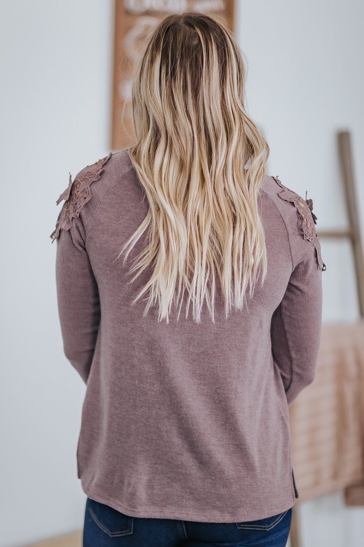 Give Me One Reason Long Sleeve Lace Shoulder Top in Mocha