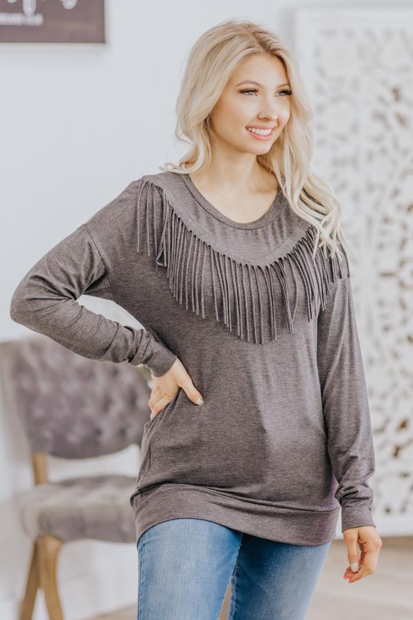 Come Dance With Me Fringe Detail Long Sleeve Top In Charcoal