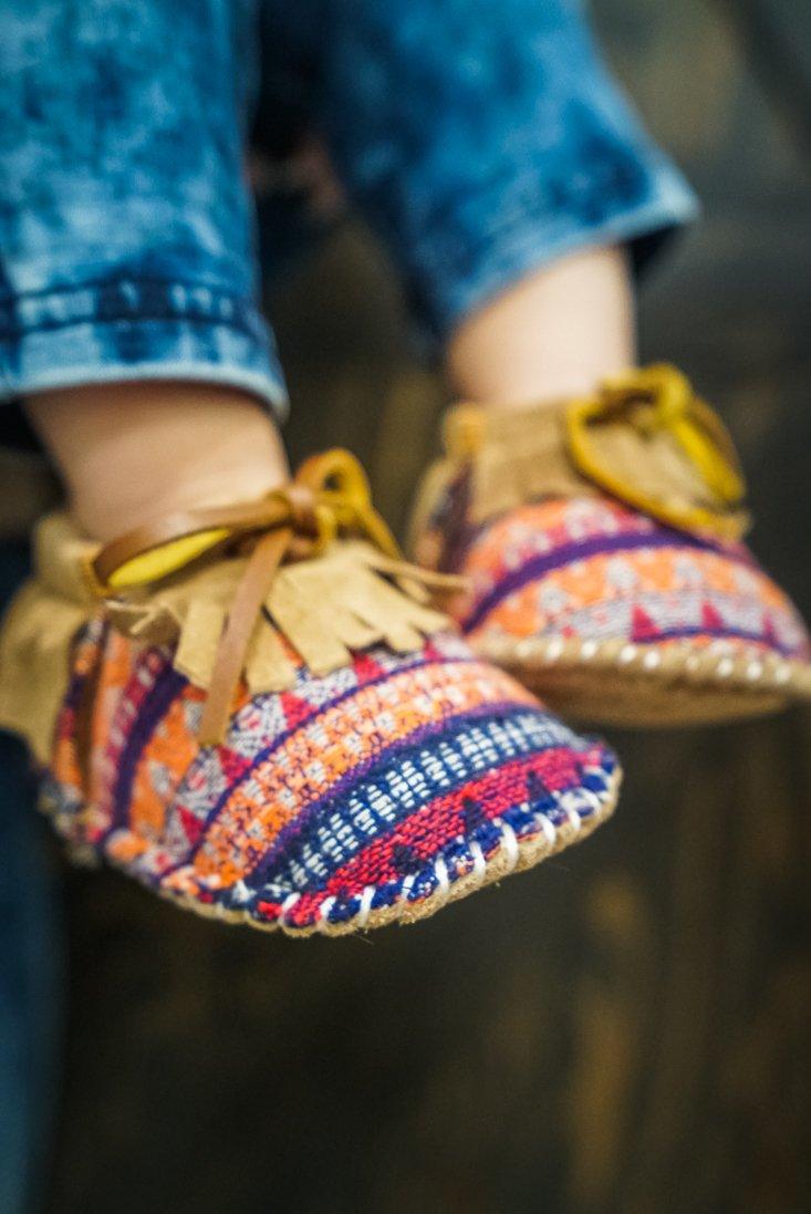 BABY/TODDLER: Moccasins in Multi-Colored Striped Print and Chestnut Fringe*