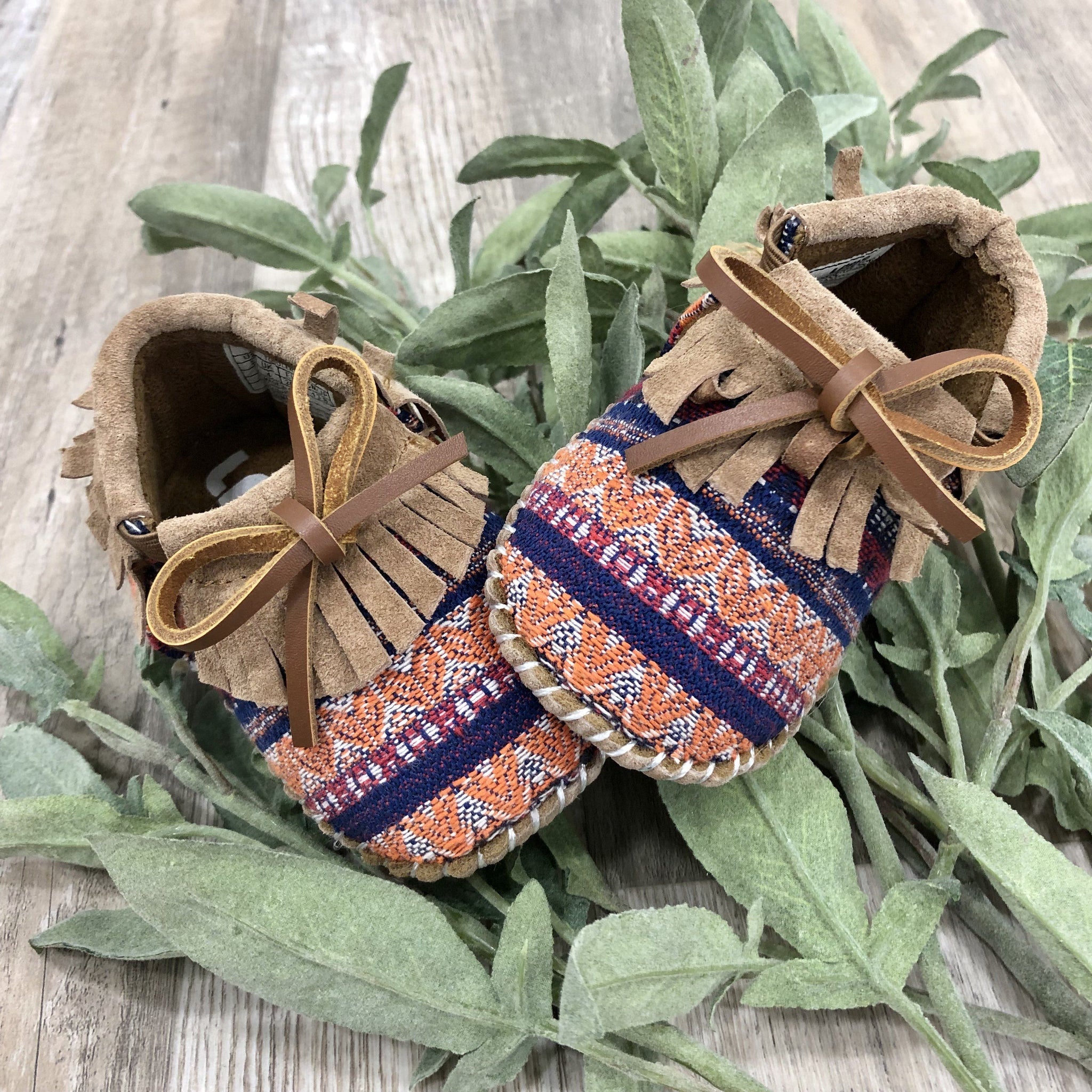 These amazing moccasins are a MUST for your little ones! They feature a multi-colored stripe print with chestnut fringe around the top and the cutest bow! These are super comfy!