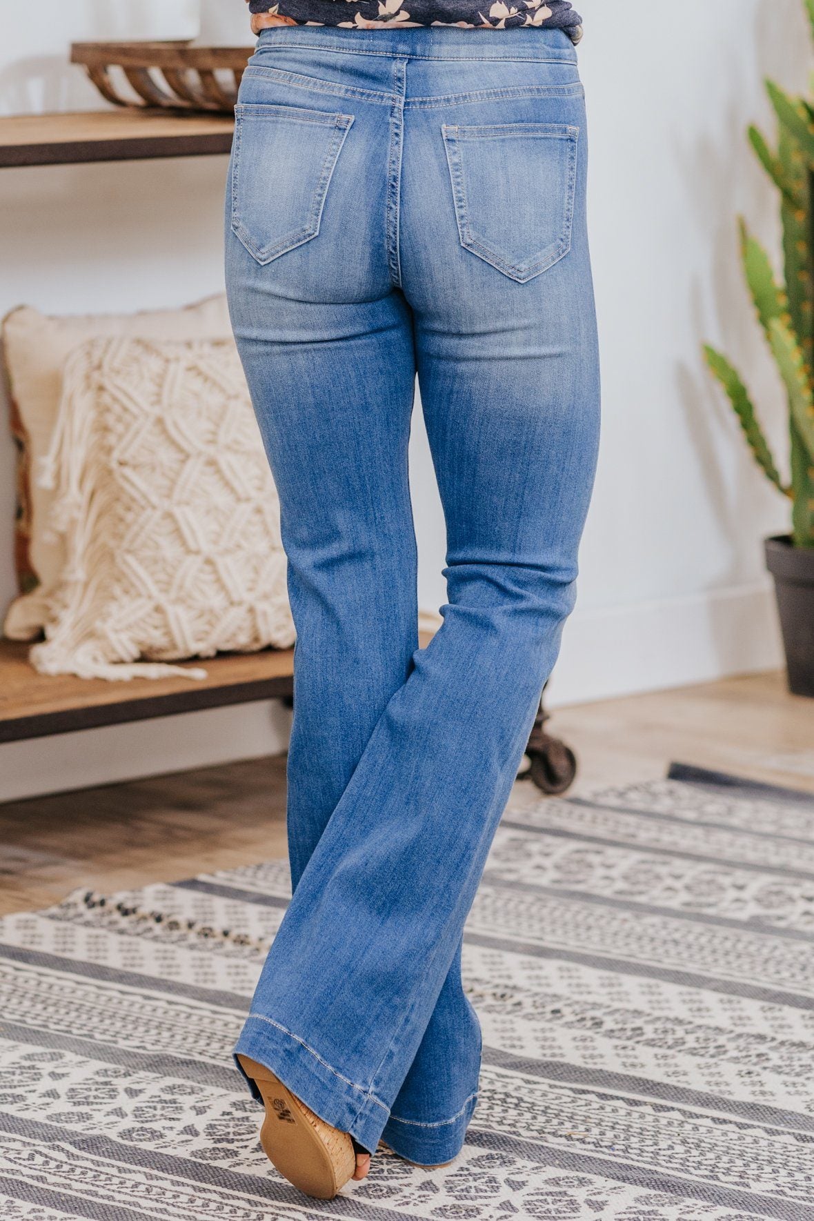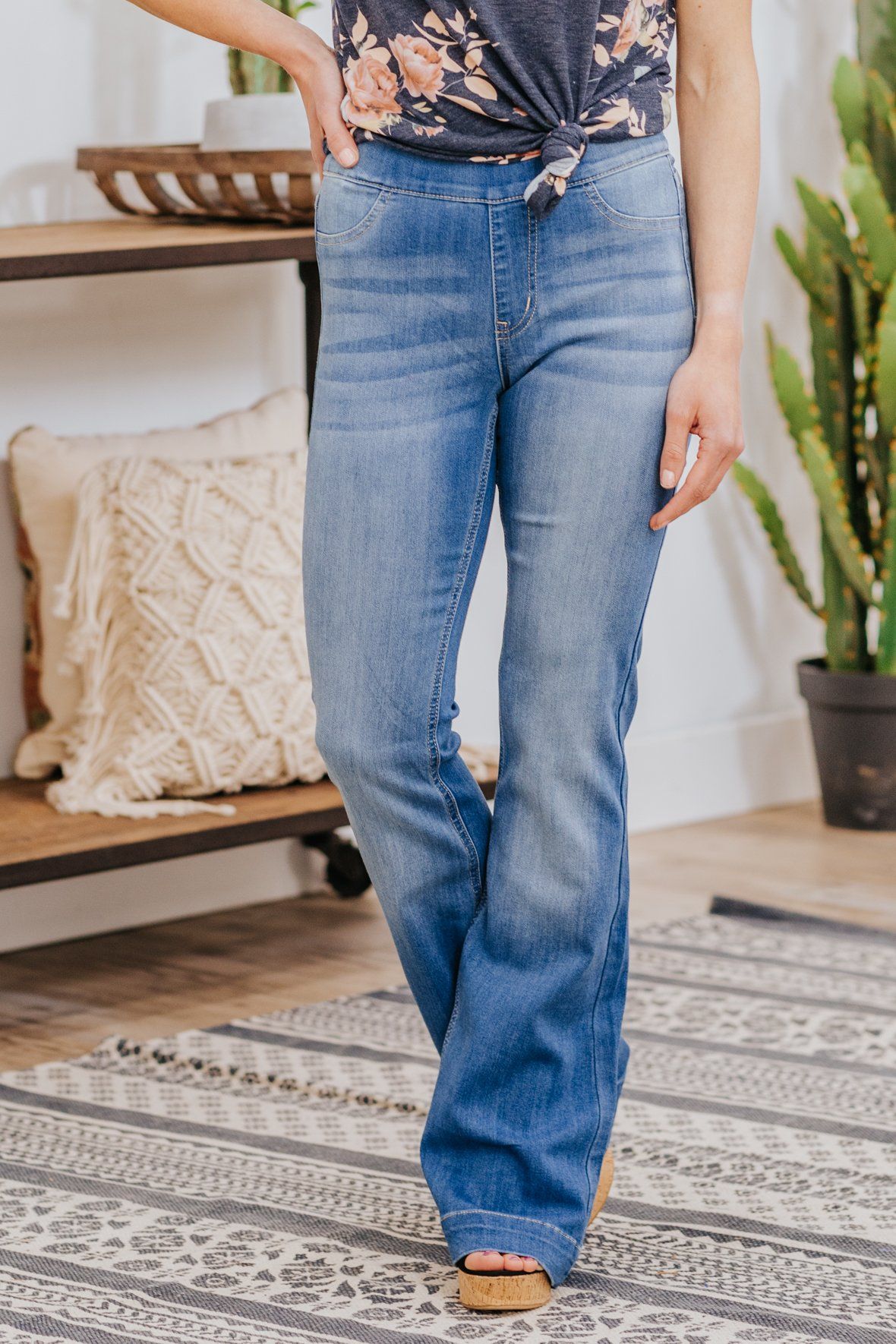 These flare jeans will be the most comfortable pair in your wardrobe! They have a medium rise and a light wash with an elastic waistband for a super comfortable fit!