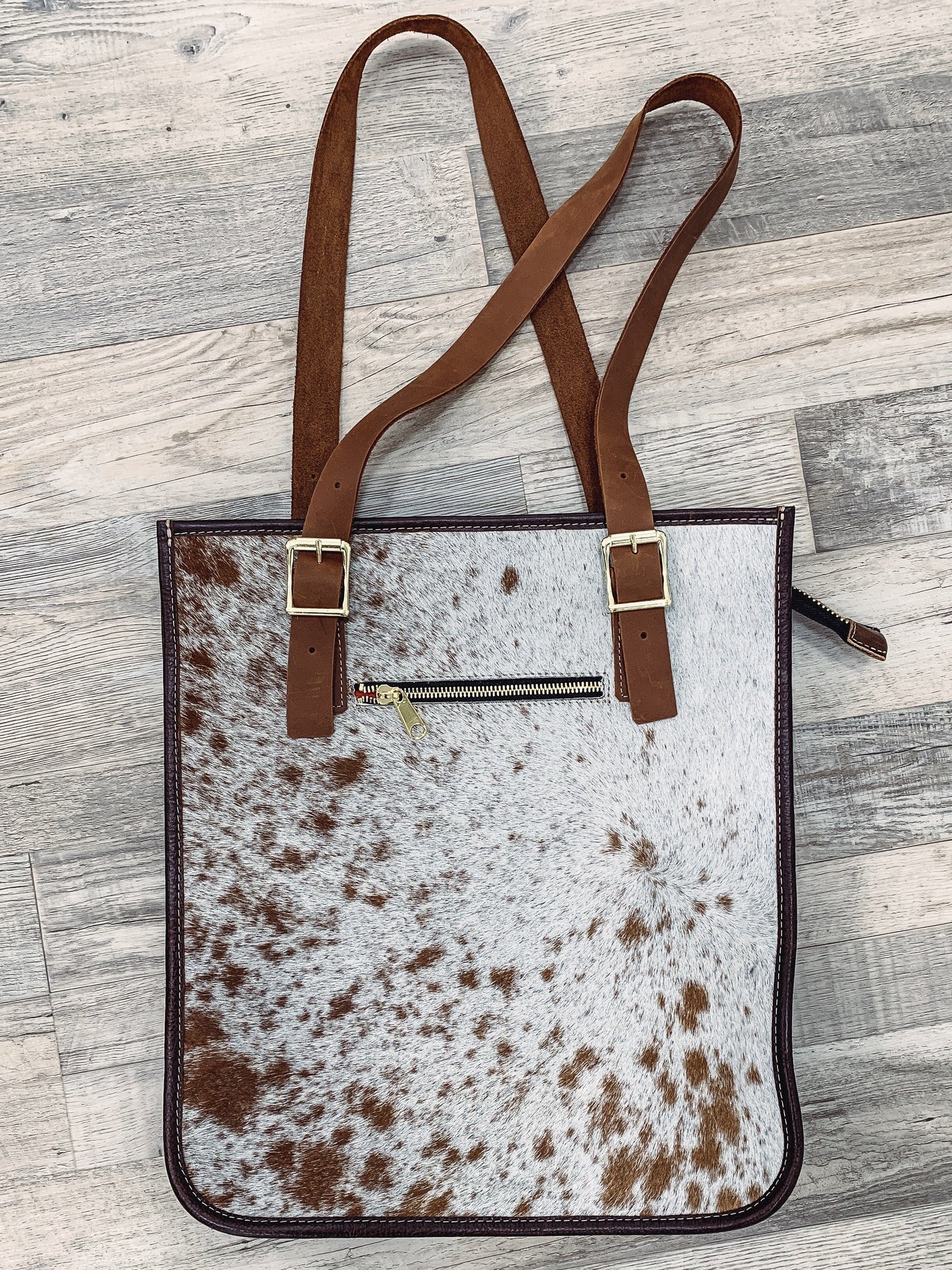 This stunning one of a kind purse is an investment piece that will last! It features a brown and white short hair cowhide with brown leather. This one has two handles and gold buckles and zippers. This one has a zipper enclosure to keep your items secure inside!